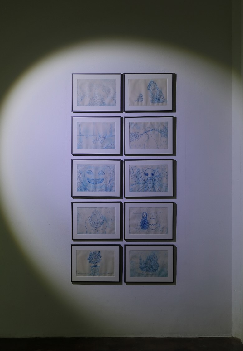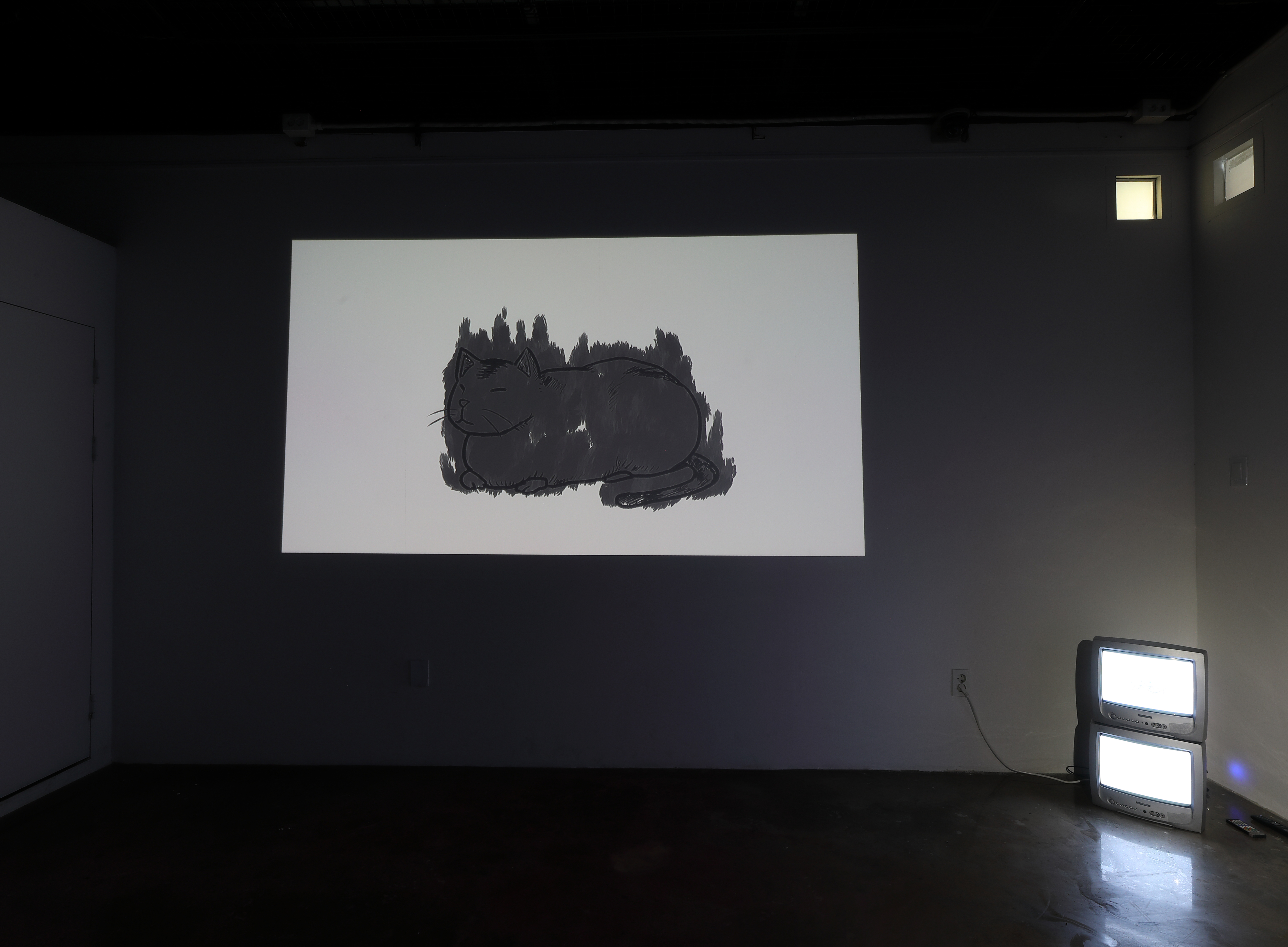 내가 체감하는 상황을 정확하게 적어놓은 첫머리 글귀는 이 전시를 봐야 할 이유였다. 나만 그렇게 느끼는 게 아니었구나. 전시장은 인천 미추홀구 시장 초입에 있었다. 마침 추석 연휴 전날이라 시장을 찾는 사람이 많아 COVID-19 사회적 거리두기가 조금은 무색해졌다. 초입에 위치한 전시장에는 아담한 사이즈에 다섯 개 애니메이션 작업이 루프로 돌아가고 있었고 다른 벽에는 드로잉과 시나리오가 전시되고 있었다. 복잡한 바깥세상과 단절된 곳에서 오롯이 영상에 집중 할 수 있었다. 마치 고양이 밥을 줄 때처럼.