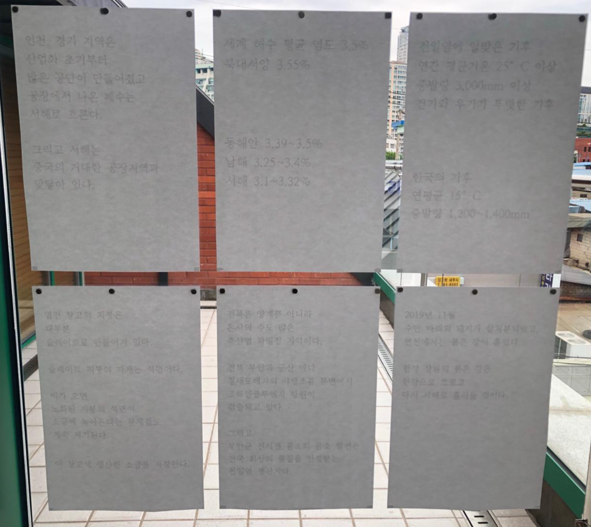 이어지는 창문의 전시는 김화용 작가의 <화성에도 짠물이 흐른다>로, 흐릿한 인쇄상태와 달리 매우 직접적으로 메시지를 꽂아 넣는다. 다양한 자료를 통해 수집한 소금에 관한 정보들을 문자로 인쇄하여 창문에, 벽에, 전시대에 배치했는데 담담한 서술 속에는 한국 근현대사의 아픈 이야기로 가득하다. ‘짠물’의 대명사로 불리는 인천의 풍경도 여러 번 호출되었다.