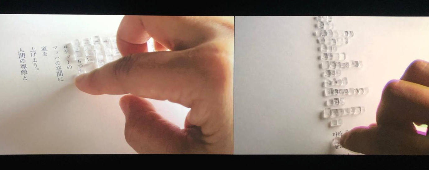 키요코 사카타의 작품은 재일조선인의 시의 구절을 인쇄한 문자 위에 소금 결정을 하나씩 내려놓는 영상으로, 반짝이는 소금 알갱이는 마치 눈물도 말라버리고 결정체만 시구로 남아버린 타국의 이방인 같았다. 조국으로 가기 위해 바다를 건너려 하면 녹아버리게 되는 존재.