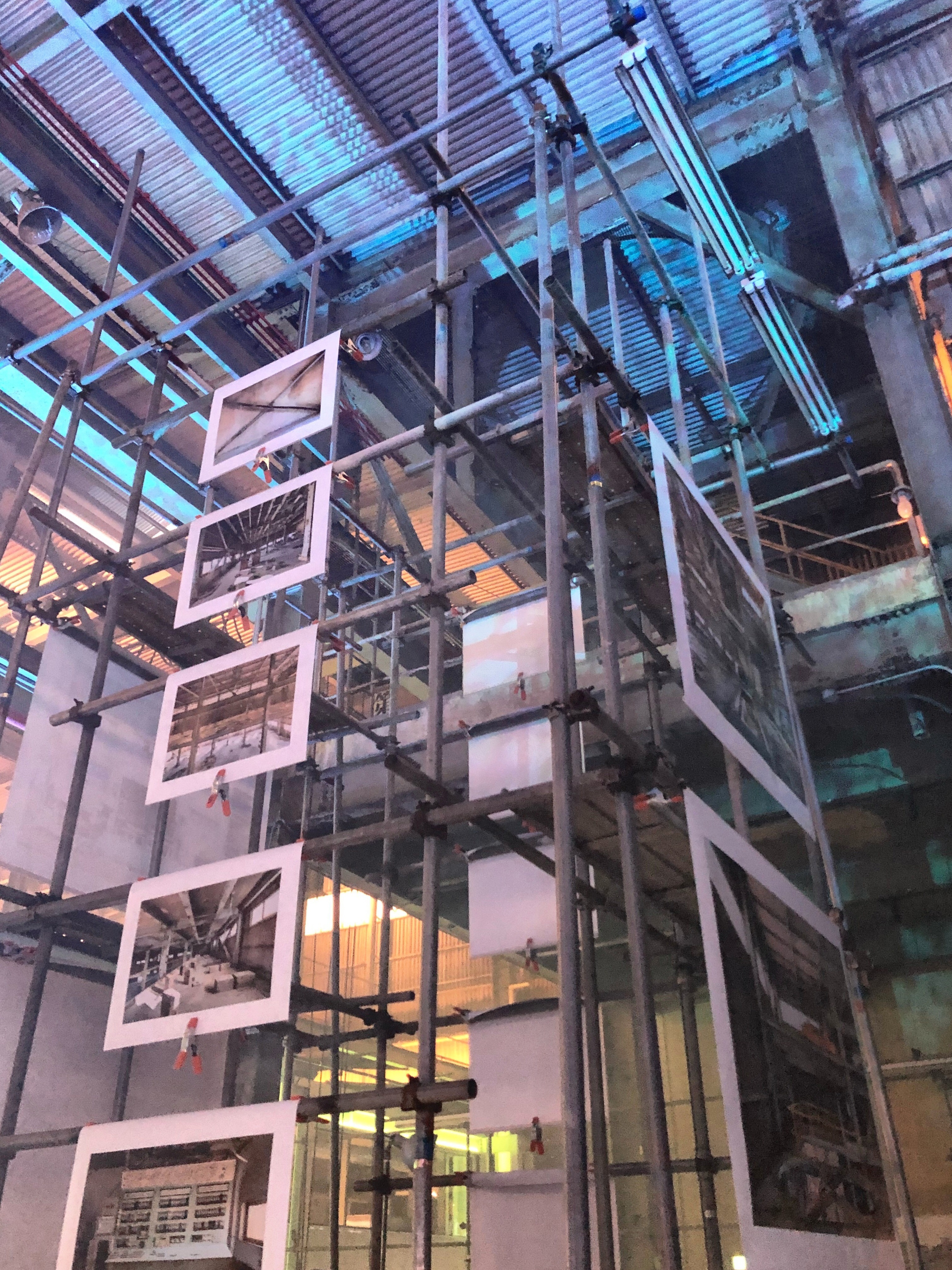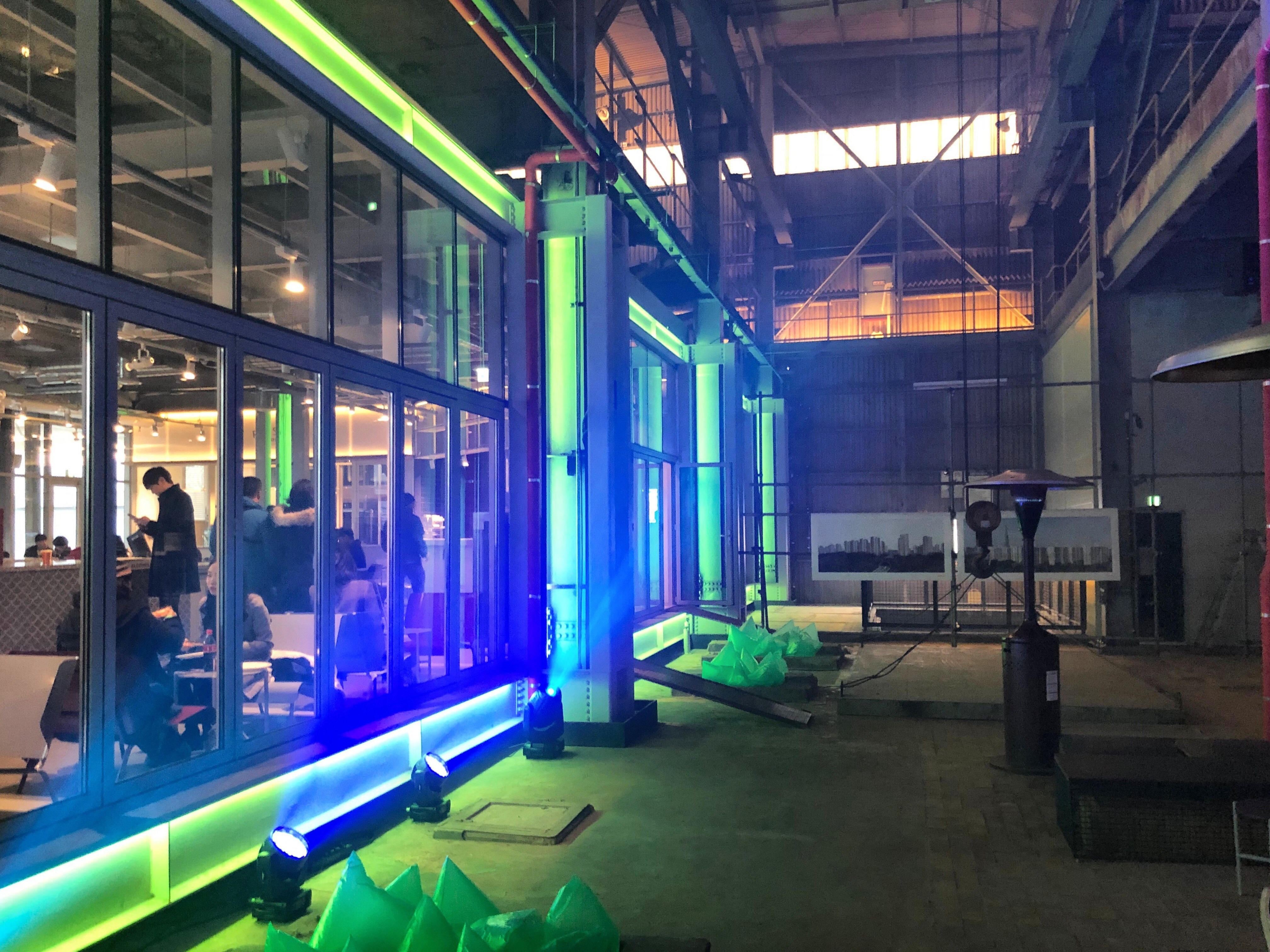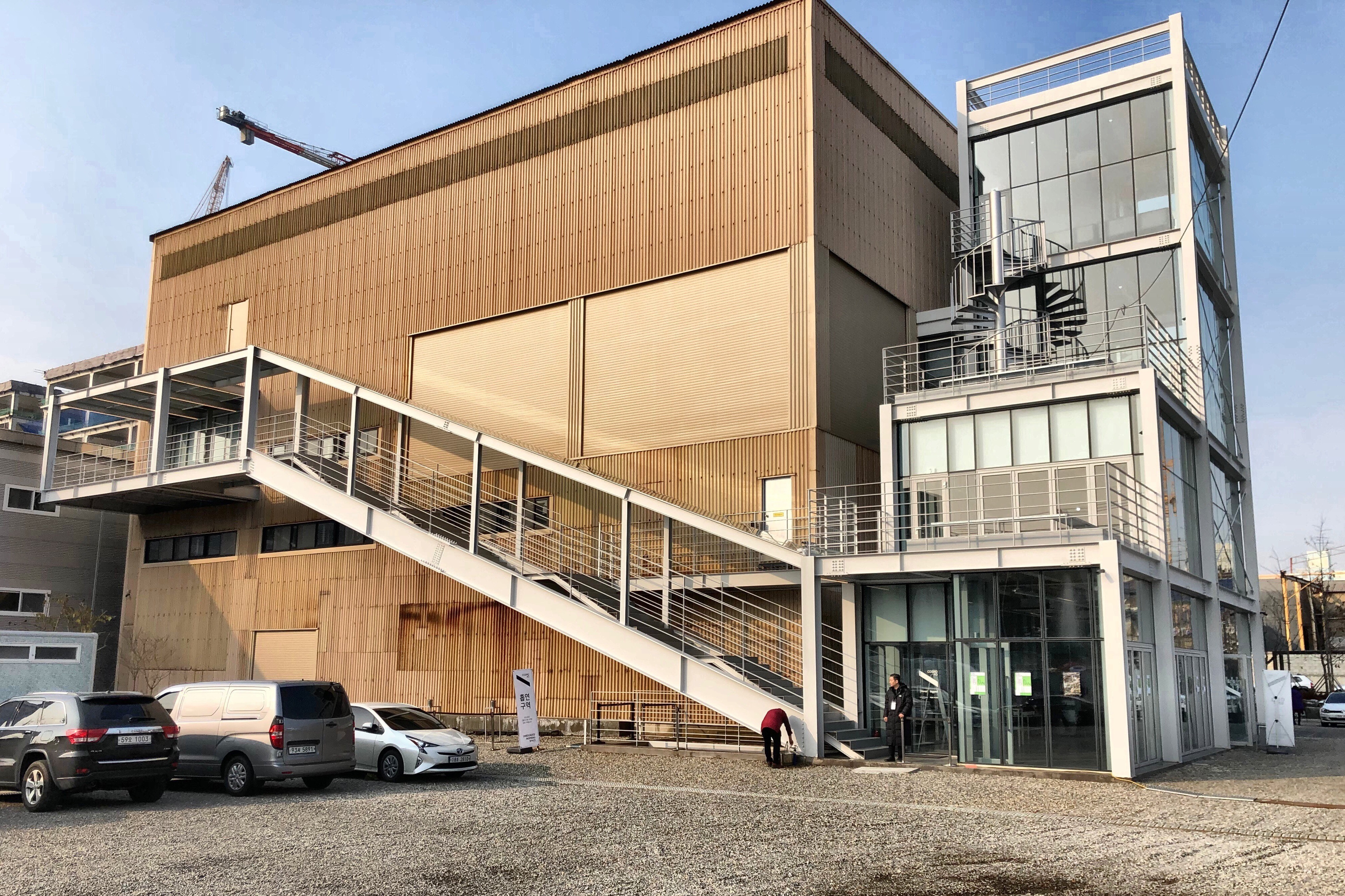 필자가 코스모40을 방문한 날에는 ‘RUN DOWN’ 페스티벌이 진행되고 있었다. 건축 사진작가 신경섭의 전시와 건축가들의 모임인 NUNA의 대담이 열렸고, 동시에 로컬 뮤지션과 DJ의 라이브 공연이 릴레이로 다음날 새벽 6시까지 이어졌다. 전시와 공연, 대담 프로그램이 한 공간에서 동시에 진행됐다. 코스모40은 공장 건물을 그대로 유지한 채, 새로운 건물을 끼워 넣는 형식으로 증축됐다. 1~2층의 내부는 구획이 없는 하나의 커다란 공간이다. 그래서 신경섭 작가가 찍은 건축 사진을 보는 내내 클럽 음악 소리가 건물 전체에 울려 퍼졌다. 사운드로 인한 진동도 온몸으로 느껴졌다. 클럽에서 볼 수 있는 하얀 연기도 이따금 시야를 가렸다. 어디에서도 경험하지 못했던 공연과 전시의 이색 조화였다.