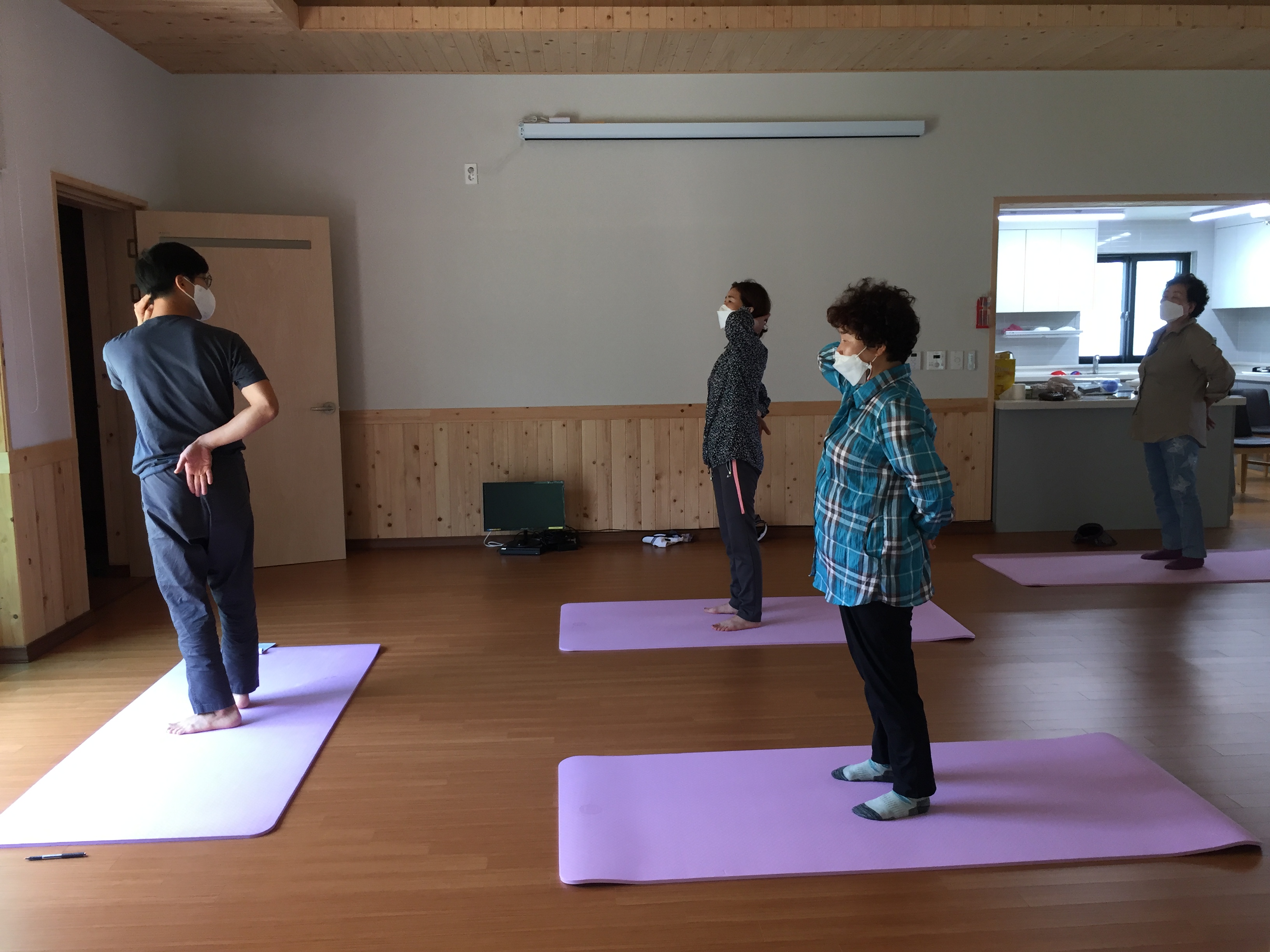평생의 습관을 몸이 기억한다는 말처럼 주민분들은 무릎과 허리 관절이 좋지 않았다. 그래서 휴식과 회복을 위한 체육활동 혹은 소야도만의 특별한 체조를 만들어보자고 장현준 작가에게 제안했다. 작가는 사전 답사를 통해 주민들의 움직임을 관찰한 뒤, 관절에 무리가 되지 않는 동작들로 구성된 소야체조를 만들었다. 특정 동작에서 몸을 움직이는데 어려움을 느끼는 참여자에게는 무리하지 않을 것을 요청하였고, 몸의 한계 안에서 작은 변화에 귀 기울일 수 있도록 진행했다. 사실 의식적으로 근육의 긴장을 풀고 잘 쉬는 것도 훈련이 필요하다. 동작을 잘 따라하고 싶은 마음에 열심히 하는 참여자에게 오히려 천천히, 덜 열심히 해달라고 요청하기까지 했으니 말이다. 2시간의 워크숍 후 참여자들은 자신의 몸 상태와 변화를 이야기하기 바빴다. 코로나 상황 속에서 위축된 몸을 회복하는 시간이자, 동시에 오랜만에 모인 서로의 관계를 회복하는 시간이 아니었을까.