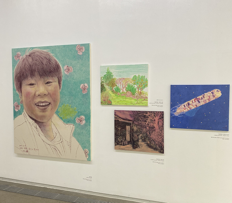 전시장 한켠에 무언가 붓질이 이질적인 그림이 눈에 들어온다. 잘 그리는 것에 무심한 듯 슥~슥~슥~! 그려낸 초록의 풍경화와 당장이라도 이빨을 대고 물어 배고 싶은 옥수수 그리고 불그스름한 어둠이 깔린 길목풍경화 그려져 있다. 작가가 제주에서 4천평의 농사를 짓고 있는 최복인(1971- )을 만나 그린 그림이다. 야생의 풀밭을 터전 삼아 살아가는 그 삶에 작가는 3점의 그림을 품앗이를 한다. 이와 같은 야생의 돌몸으로 드러나는 삶에 대한 에너지는 최복인님의 풀밭에서만 넘쳐나지 않는다. 2층 전시장으로 이어져 볼 수 있는 군상작품 속, 뽀글뽀글 파마머리에 화려한 무늬가 새겨진 몸빼 바지를 차려 입은 할머니 걸음걸이가 그러하다. 그들은 종종거리지만 넓은 보폭으로 머뭇거림 없이 다가온다. 그림 속 할머니들이 향하는 곳은 무서울 것도 두려운 것도 없다. 평생 밥을 짓고 나물을 다듬으며, 시대의 수난을 온몸으로 받아낸 그들의 얼굴 없는 할머니들의 인생은 이렇게 다음세대의 뒷심이 된다. 이렇게 나는 힘차게 동시대를 사는 터전을 활보한다.