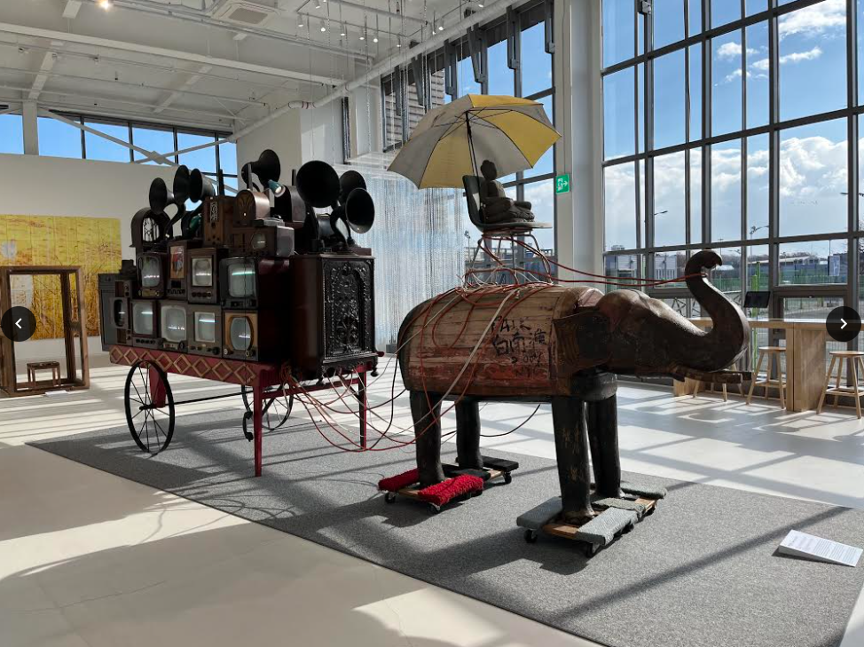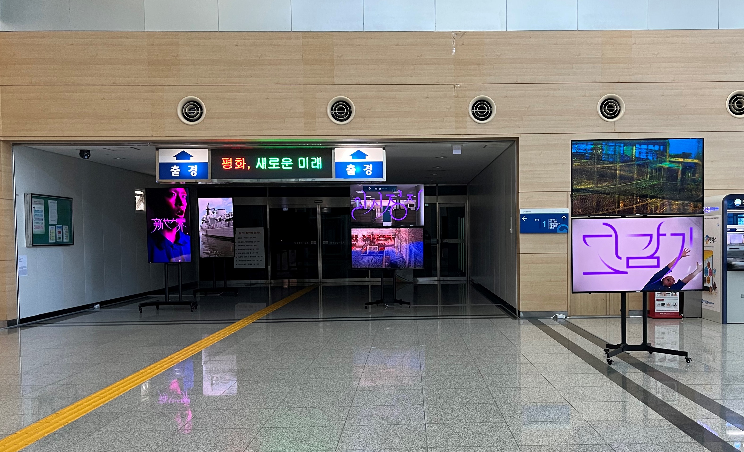 처음에 보았던 출경의 방향을 가리키는 싸인물, 그리고 이부록의 작업을 보면서, 경계와 접경의 서사와 그 감각을 재구성하는 것은 어떤 방식으로 가능할까를 생각해 보았다. 경계의 이야기는 대부분 접경지 인근과 언저리를 맴돈다거나, 혹은 경계 너머의 저쪽 방향을 보고 있다. 유니마루에 전시된 백남준의 작업《코끼리 수레》(2001)에서 코끼리가 개성 방향을 향해 서 있는 것처럼 말이다. 경계와 접경의 이야기의 방향을 전방에만 두는 것이 아닌 후방과 연결하는 시도들은 어떨까. 출경장 입구에 있었던 양아치의 작업《미들코리아》(2021)를 염두에 두고 하는 말이다. 이 작업은 접경 지역과 전쟁기념관 등 일상적 장소, 그리고 남쪽도 북쪽도 아닌 제3의 공간과 무용수들의 행위를 교차시킨다. 접경의 서사와 감각을 다양한 방식으로 제안하기 위한 하나의 방법으로 경계와 접경의 이야기를 이남의 체계와 보통의 일상으로 연결하는 예술적 시도들에 더 주목해 보는 것은 어떨까 싶다. [ ]