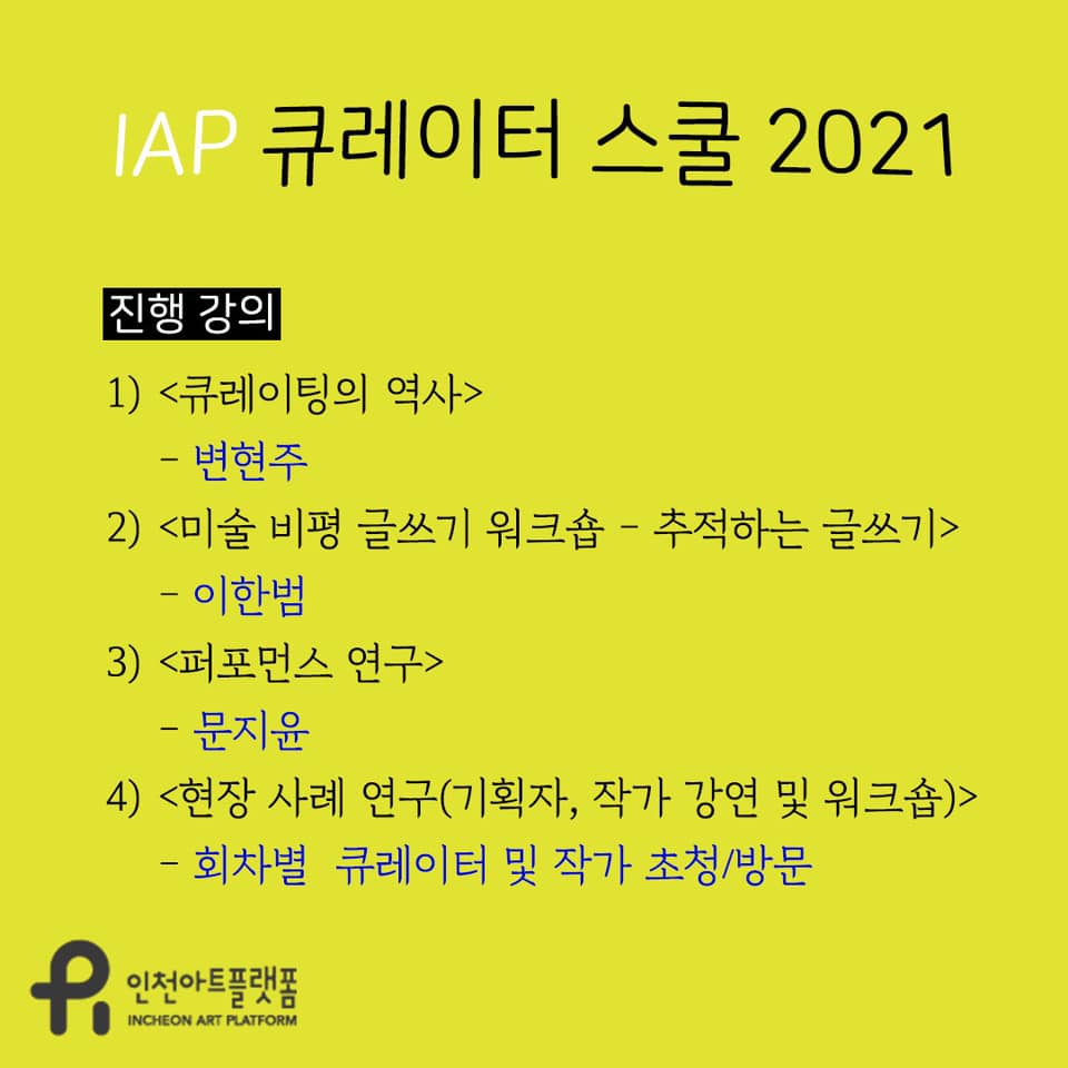 인천아트플랫폼에서 주관한 전시 기획자 교육 프로그램 <큐레이터 스쿨 2021>은 작년 4월부터 올해 4월까지 약 1년간 (비)정기적인 모임을 가지는 워크숍 형태로 진행되었다. 참여자들은 현재 기획자로 활동하고 있는 사람들과 기획으로 예술계에 진입하고자 하는 사람들로 구성되었다. 프로그램 초반은 긴 호흡의 강연들과 현장에서 활발히 활동하고 있는 선배 기획자들의 릴레이 강연이 진행되었고, 이후 참여 기획자들이 직접 프로그램의 방향을 설정하고 구체적인 내용과 활동을 직접 조직하는 방식으로 진행되었다. 2021년 11월부터는 본격적인 결과보고 기획전 프로덕션에 착수하였다.