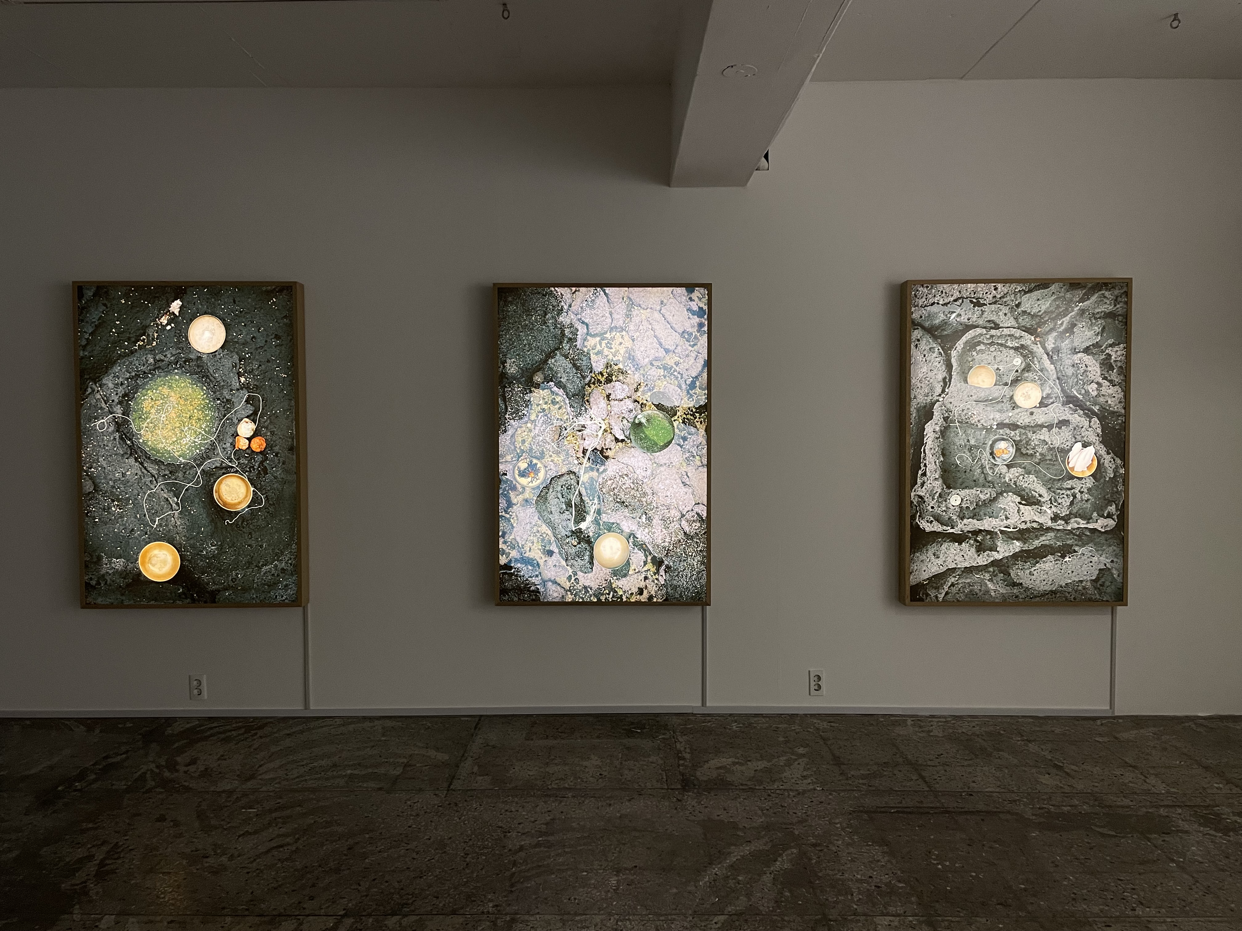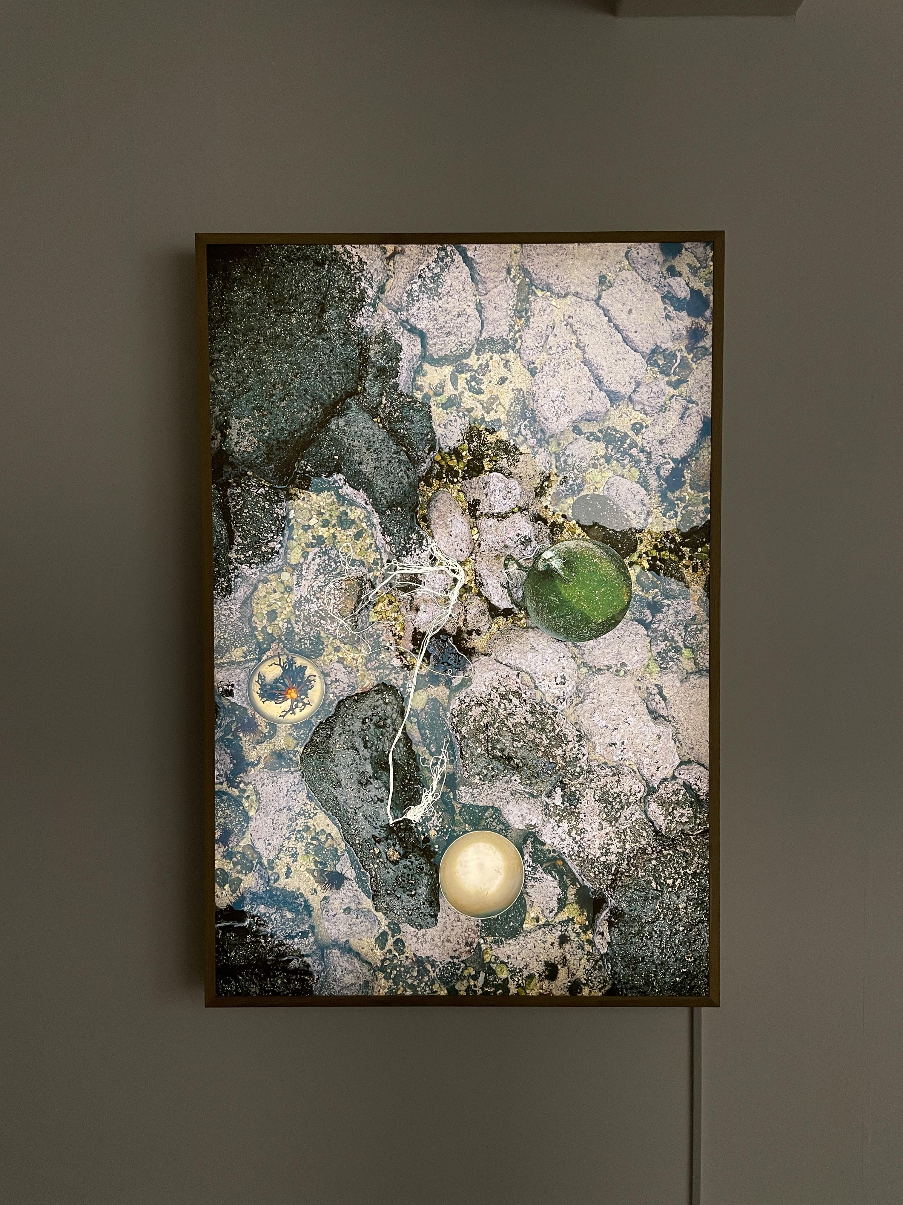 ‘디아스포라’는 공동체의 기억과 역사를 담고 있는 장소에서의 이주에서 기인한다. 즉 공동체의 역사성은 그 물리적 장소성을 전재로 하여 형성되기에 ‘멀리 떨어져 있음’, ‘떠나옴’과 같은 이탈의 상황이 디아스포라를 양산하기 때문이다. 하지만 제인 진 카이젠은 그러한 물리적 거리를 넘어선, 저승과 이승의 넘나듬과 같은 시공간의 제약을 초월하는 신화적 상상으로 디아스포라의 경험과 기억을 교차시키고 분열된 것을 모은다. 작가는 개인전 제목이자 작품명이기도 한 <달의 당김 (The Pull of the Moon)>(2020) 에서 바닷물에 잠겼다 드러나길 반복하는 제주 하도리 해안을 조명상자를 이용한 사진으로 선보인다. 제주 바다의 현무암 바위와 해초 새우들의 갑각류, 모래 그리고 돌멩이를 비롯하여 감귤, 쌀, 황동 제기와 명실(장수를 기원하는 무명실)와 같은 제의를 위한 제물들을 함께 담아내고 있다. 현무암 돌 위에 놓인 제의 음식들은 제주 해녀들과 심방들이 그들의 안녕을 기원하고자 하는 바램을 담은 일종의 무구(巫具)인 셈이다. 작가는 이 자연 위에 놓은 제물들의 풍경이 인간과 바다 및 자연이 교감하는 겸허한 접근’으로 보았다. 달의 인력으로 인해 드러나고 잠기기를 반복하는 해안은 밀물과 썰물이 따라 육지도 바다도 아닌, 어느 쪽에도 속하지 못한 소외된 장소를 뜻한다. 일종의 경계에서 서로 다른 세계로의 접점과 만남을 상상케 하는 것이다. 라이트 박스로 비춰진 이 사진작업은 매우 생생하게, 해수의 투명함과 현무암 조각들을 담아낸다. 자칫 어느 행성의 표면 처럼도 여겨질 만큼 생경한 인상을 주기도 하는데, 달 표면과 같이 몇 광년 떨어진 행성은 필히 존재하는 것임에도 초현실적인 감각으로 다가온다. 드러났다 잠기길 반복하는 이 깅이통(조수웅덩이를 의미하는 제주말)은 우리 발 밑에 존재하지만, 우리의 시선이 드넓게 펼쳐진 바다에 둔 사이, 미쳐 살피지 못한 주변부이자 잊혀진 장소로 존재한다. 이렇게 디아스포라는 묵직한 담론으로 다가오기 보다는 반복된 일상 속 장면에서 시야 언저리에 뭉개진 사소한 인상에서도 찾아질 수 있지 않을까.