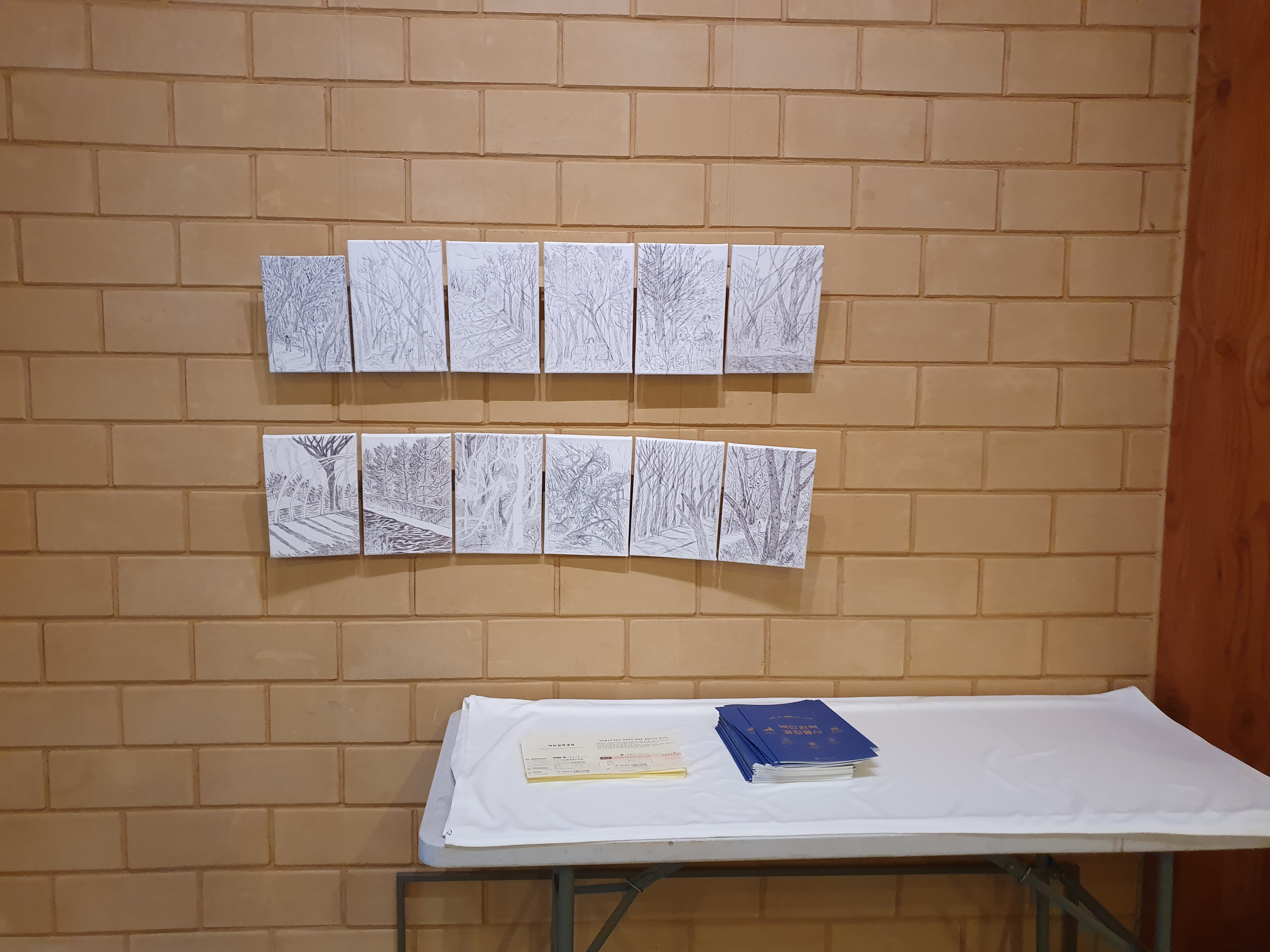 입구를 지나 무설전으로 들어서면 전면에 불보살이 모셔진 법당이 차려져 있어 예사의 법당과 특별히 다를 것이 없다. 갤러리 관람객은 신발 벗을 일 없이 그대로 걸으면서 벽을 따라 작품을 감상하면 된다. 무설전에 들어서자 12점의 작은 화폭들이 상하 6점씩 나뉘어 나란히 걸려있다. 모두 볼펜 선으로 다양한 구도의 숲과 나무·사람·조형물을 그렸다. 하나하나 찬찬히 살펴보니 각각의 작품들이 담고 있는 감성이 확연하게 다르다. 태양의 따뜻함이 간접적으로 느껴지기기도 하고 시리듯이 춥기도 하다. 한적하기도 하고 조급하기도 하다. 하지만 12점의 작품을 한눈에 보면 조화롭다. 뒤를 이어 ‘어제의 일’,‘마른 오후’,‘10월’,‘아직 겨울’,‘가까이 혹은 멀리에 있는 오후’,‘7월’,‘밤과 밤’이 차례로 전시되어 있다.