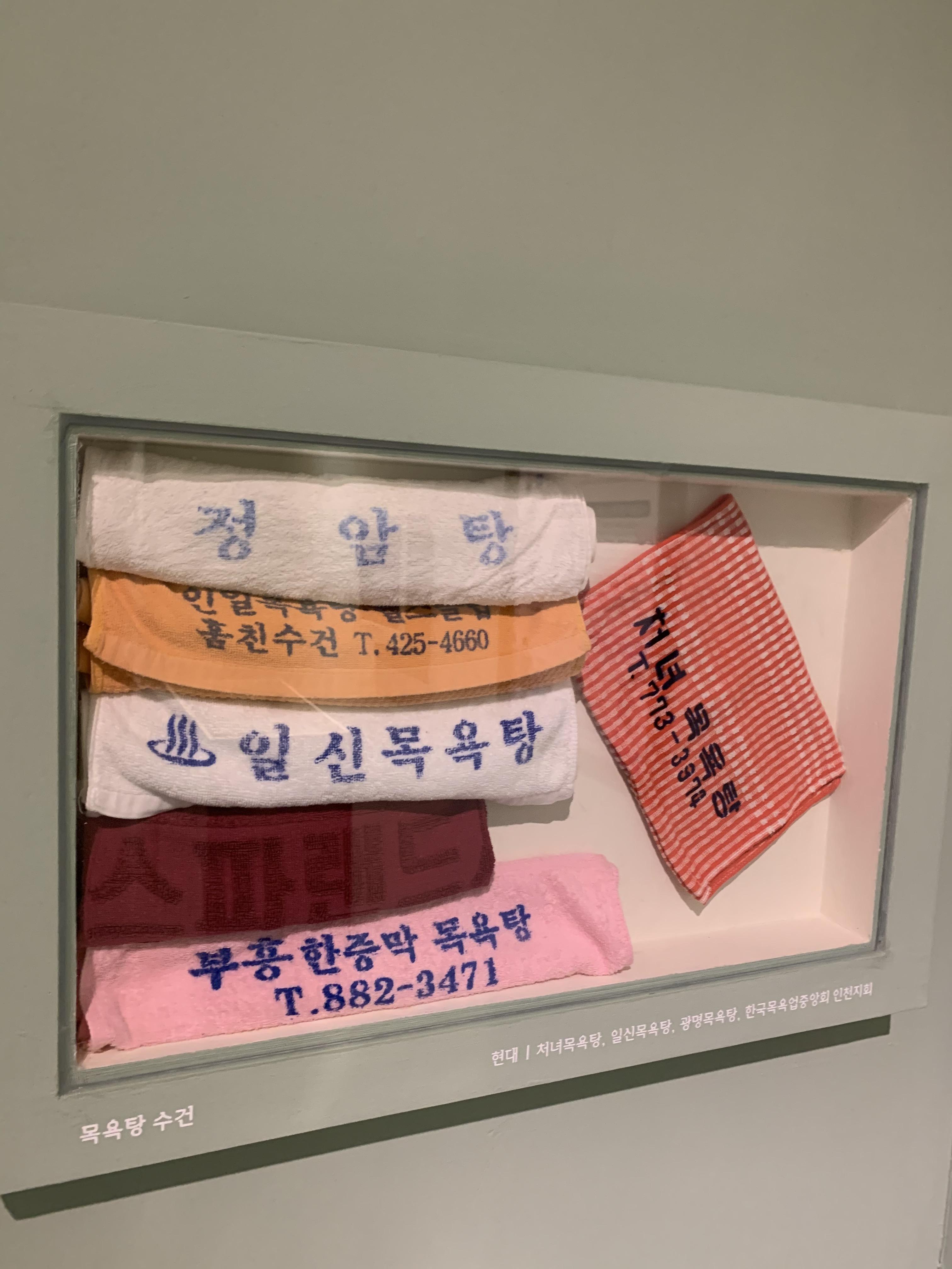 한국 고유의 목욕문화라고 할 수 있는 ‘때밀이’ 세신사와 ‘이태리타월’로 불리던 때수건, 때밀이대(세신 침대)가 전시장에 등장하자 교과서 속에 머물러 있던 시계바늘이 빠르게 돌아가 나의 유년 시절을 소환해낸다. 그때는 잘 몰랐던 목욕탕 주인-세신사-스피아(세신사 대타)-청소 아줌마로 이뤄진 목욕탕 생태계가 흥미롭다. 목욕탕 생태계에서 일하는 사람들 이야기는 전시 외에도 별도로 박물관에서 기록으로 남길 만한 생활사가 아닐까 싶다. 목욕탕 자체보다도 목욕탕을 이용하는 사람들과 목욕탕의 독특한 문화를 보여주는 전시 코너가 기억에 남는다. “수건을 가져가시면 도둑이 됩니다”라는 경고와 부탁의 말부터, 절도 방지를 위해 ‘훔친 수건’이라고 대문짝만하게 써놓은 수건 등이 인상적이었는데, 그 시절에는 어지간히 수건을 가져가는 사람들이 많았던 것 같다.