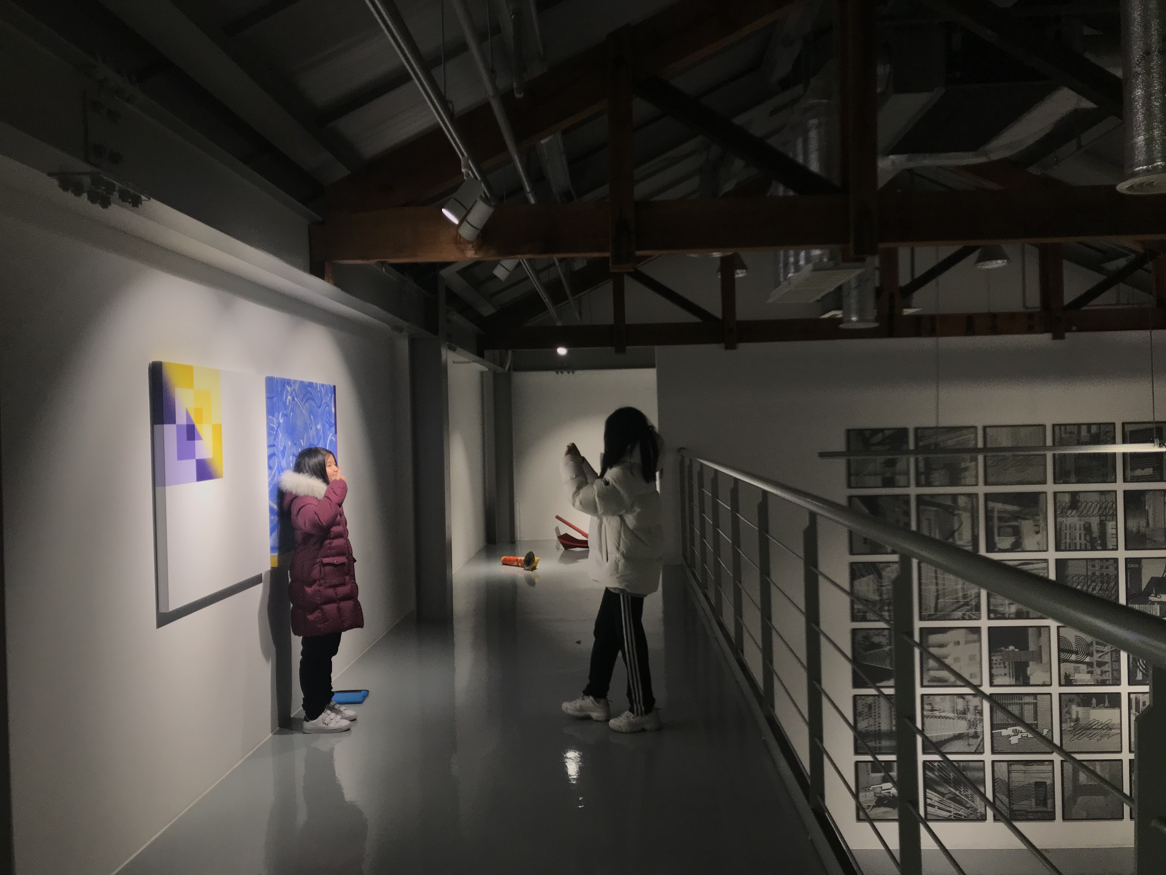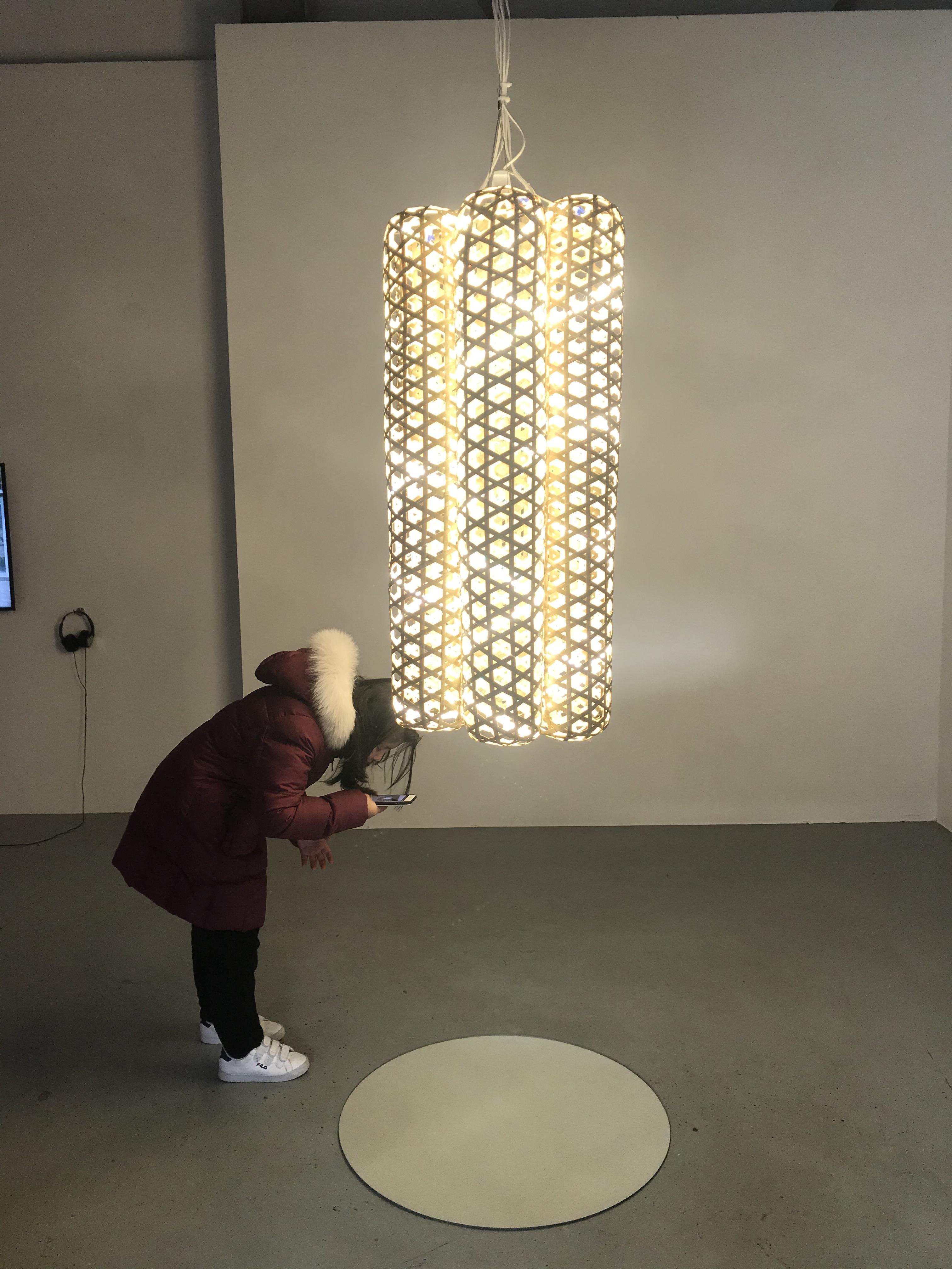 B동 전시장을 나와 윈도우갤러리를 거쳐 E동 창고갤러리로 향했다. 천장에 매달린 화려한 죽부인이 인상적이다. 7개의 죽부인을 엮어 꽃처럼 구성하고 LED 전구로 꾸몄다. 케잇 허스 리는 <세븐 시즈터즈와 생명의 연꽃>으로 육각형과 균일한 간격으로 서로 겹치는 원들의 배열을 통해 시공간의 근본적인 형태를 묘사했다. 물론 아이들에게는 작가의 심오한 의도가 중요하지 않다. 반짝이는 스마트폰 액정을 특히 좋아하는 아이들은 LED 전구로 반짝이게 꾸민 ‘죽부인 작품’이 예쁘다고 좋아했다.