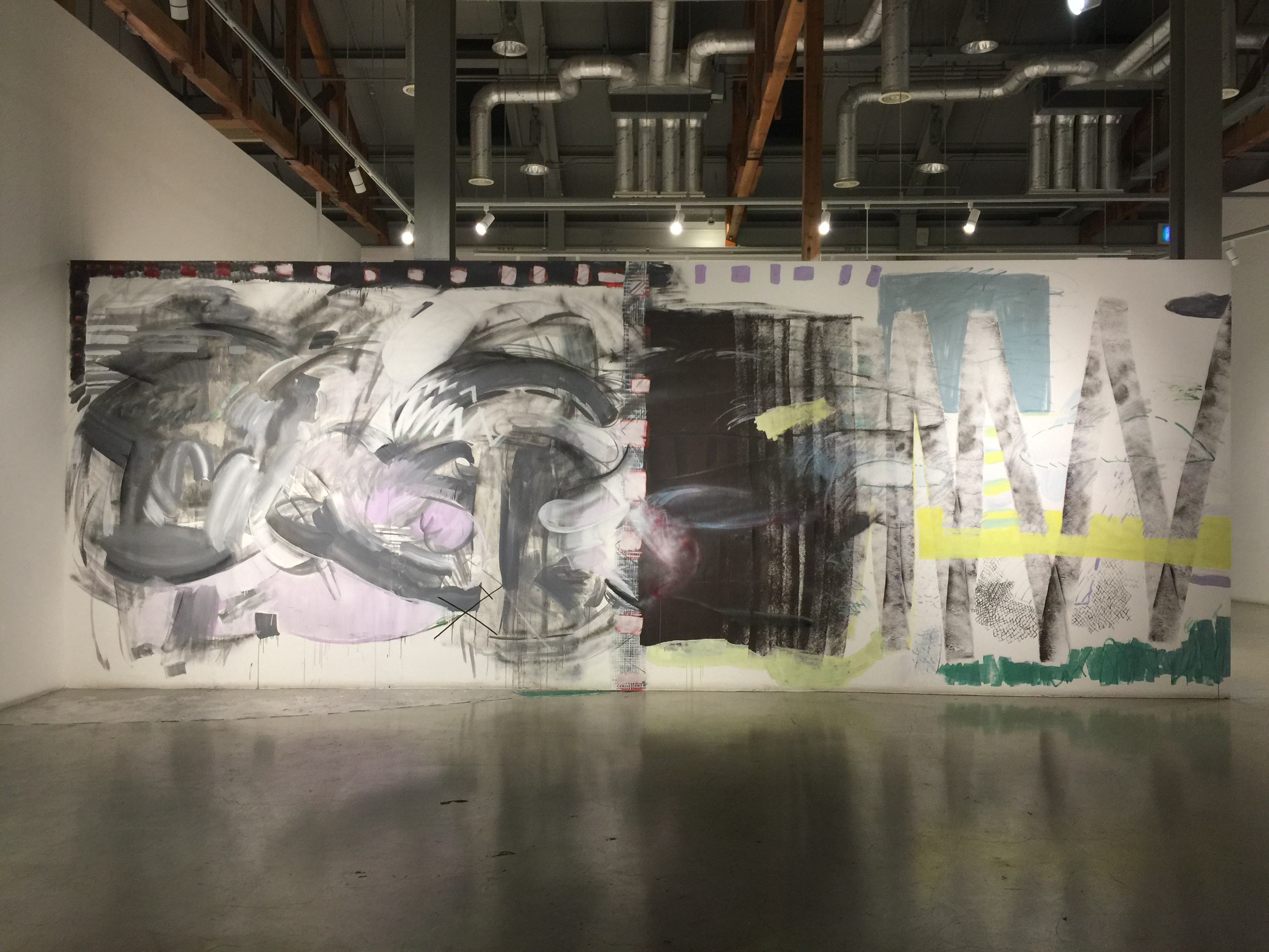 가변성의 감각은 작업의 즉흥적 생성과정에서 특히 두드러진다. 보잘것없고 내구성 약한 비닐을 늘어뜨리고 합판을 자르고 그 위에 물감을 칠한다. 작가는 이번 전시에서 미리 주문해 놓은 물감과 온갖 재료들을 가지고 전시 설치를 위해 주어진 6일 동안 이 전시장에 머물면서 자르고 붙이고 그리면서 작업을 진행했다. 상당히 즉흥적이고 산만하고 그러면서 오롯이 몰두했을 작업과정을 전시장에 들어서는 관객이라면 즉각적으로 느낄 수 있다. 별도의 사전 스케치나 에스키스 없이 바로 시작하여 적절하다고 판단되는 임의적 결정의 순간에 끝맺는다. 즉흥과 우연으로 작업이 완료되고 전시 후에 소멸되어 재생이 불가능할 거라는 것도 직감할 수 있다.