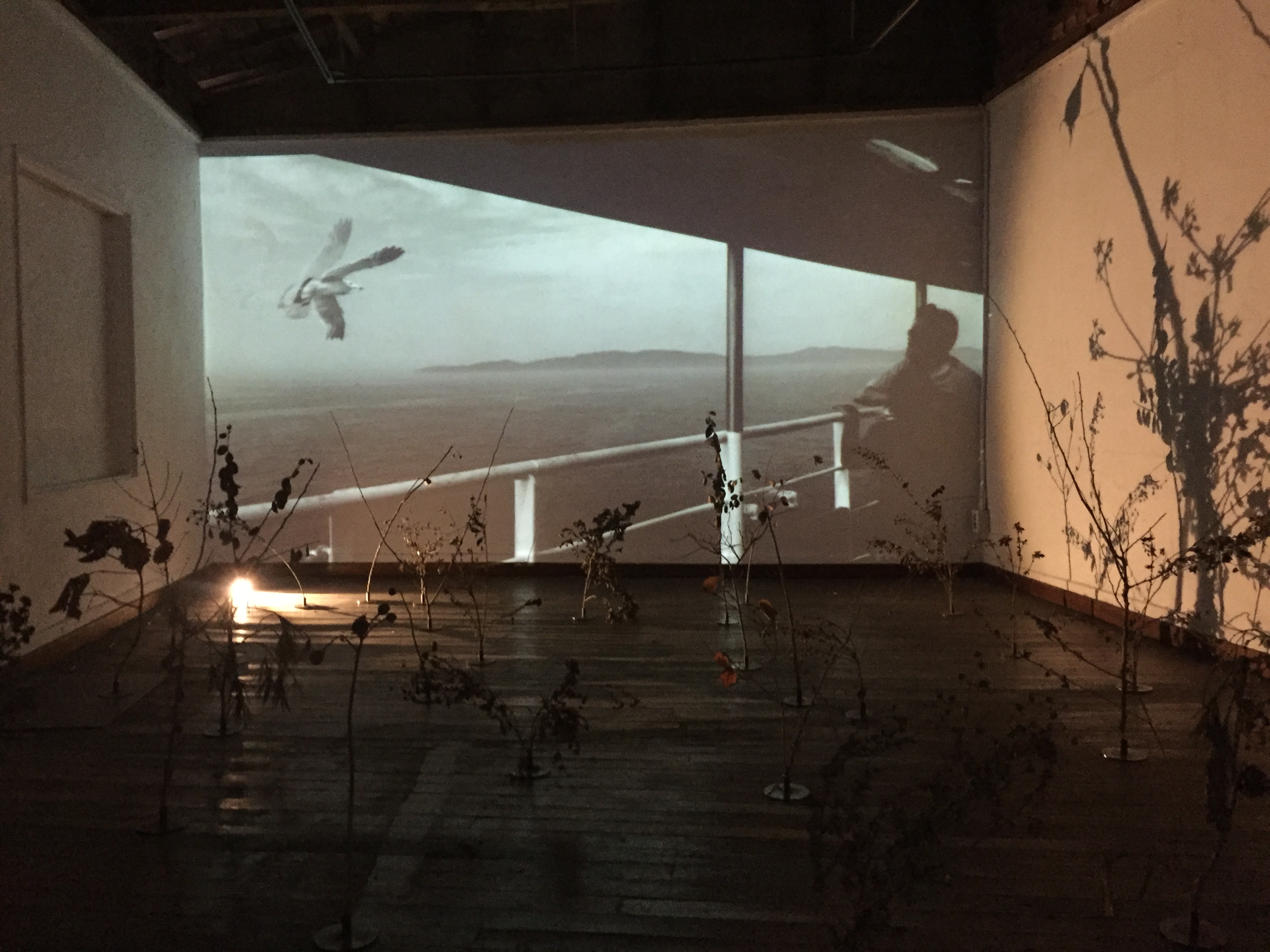 이번에 전시된 또 다른 작업 <흩어지는 경로>는 영상과 설치를 결합하였다. 섬을 오가는 배에서의 바다 풍경, 갈매기가 나는 풍경, 파도에 쓸려온 잔해들이 있는 해안가 등 섬의 풍경으로 보이는 여러 개의 영상들이 재생되면서 파도 소리가 흘러나온다. 그리고 이 영상 앞으로는 마른 꽃들이 설치되어 있다. 마른 꽃에 갯벌의 진흙을 입혀 굳혀 설치하였는데 이것이 드리운 그림자는 이 공간에 쓸쓸함과 황량한 느낌을 준다.