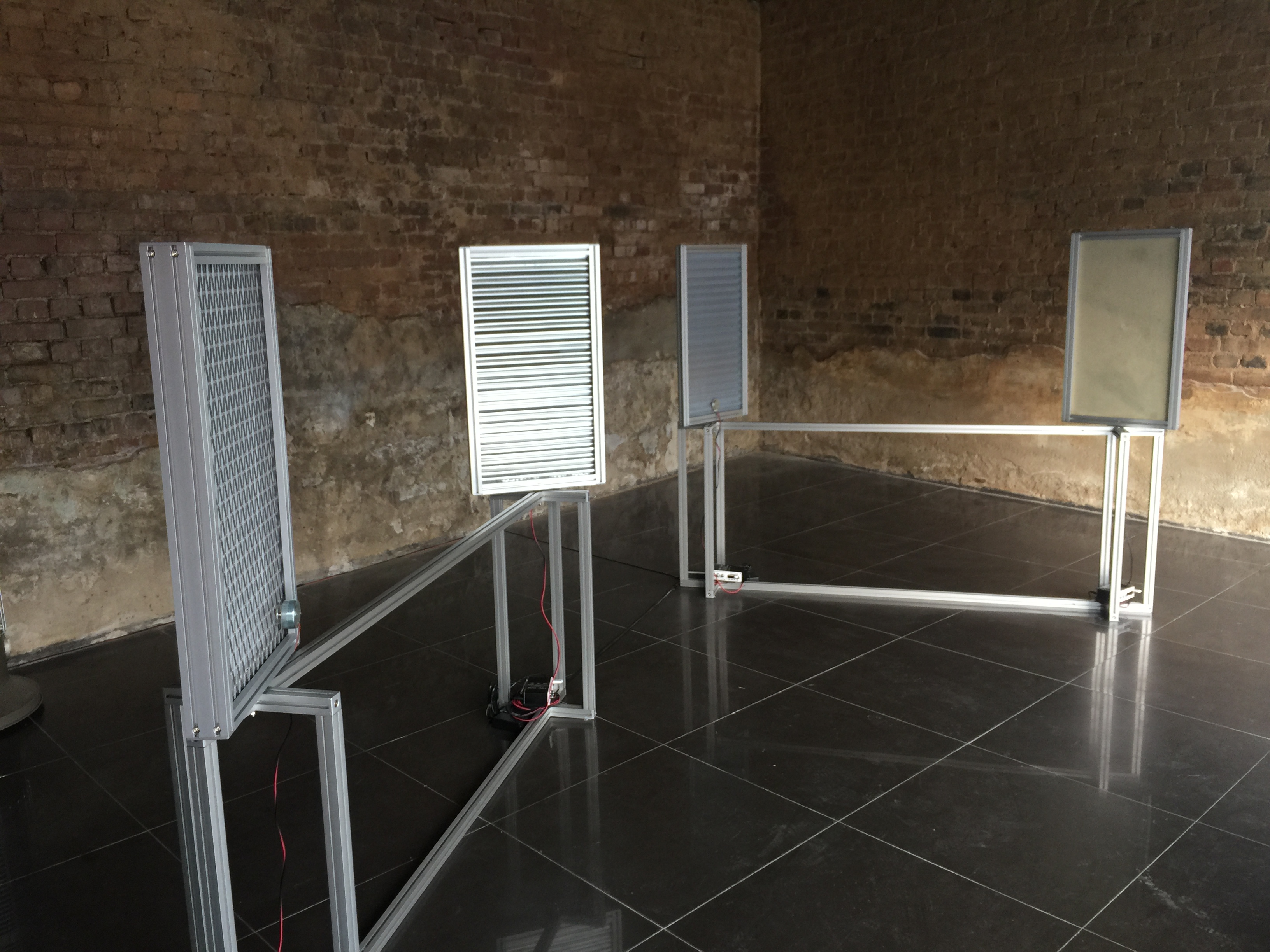 전시장에서 처음 마주하게 되는 기계장치와 그것이 내뿜는 소리는 그 정체를 알아차리기 쉽지 않았다. 그 의미를 선뜻 알아챌 수 없는 <회색입자>라는 낯선 제목처럼. 용도가 분명치 않은 알루미늄 소재의 패널 두 장이 하나의 쌍을 이루고 있고, 각 패널에서는 기계음이 나온다. 모두 동일해 보이는 패널은 프레임이 같을 뿐, 자세히 보면 프레임 내부의 표면은 모두 다른 소재로 되어 있다. 슬레이트 지붕, 염색을 한 천, 철망 등의 소재로 되어 있고, 각각의 패널에서는 메트로놈 소리, 전파 망원경 소리, 시계의 초침 소리, 라디오 주파수 소리 등 각기 다른 소리가 흘러나온다. 작가의 설명을 듣고 나서야 그 미세한 차이에 귀 기울일 수 있다.