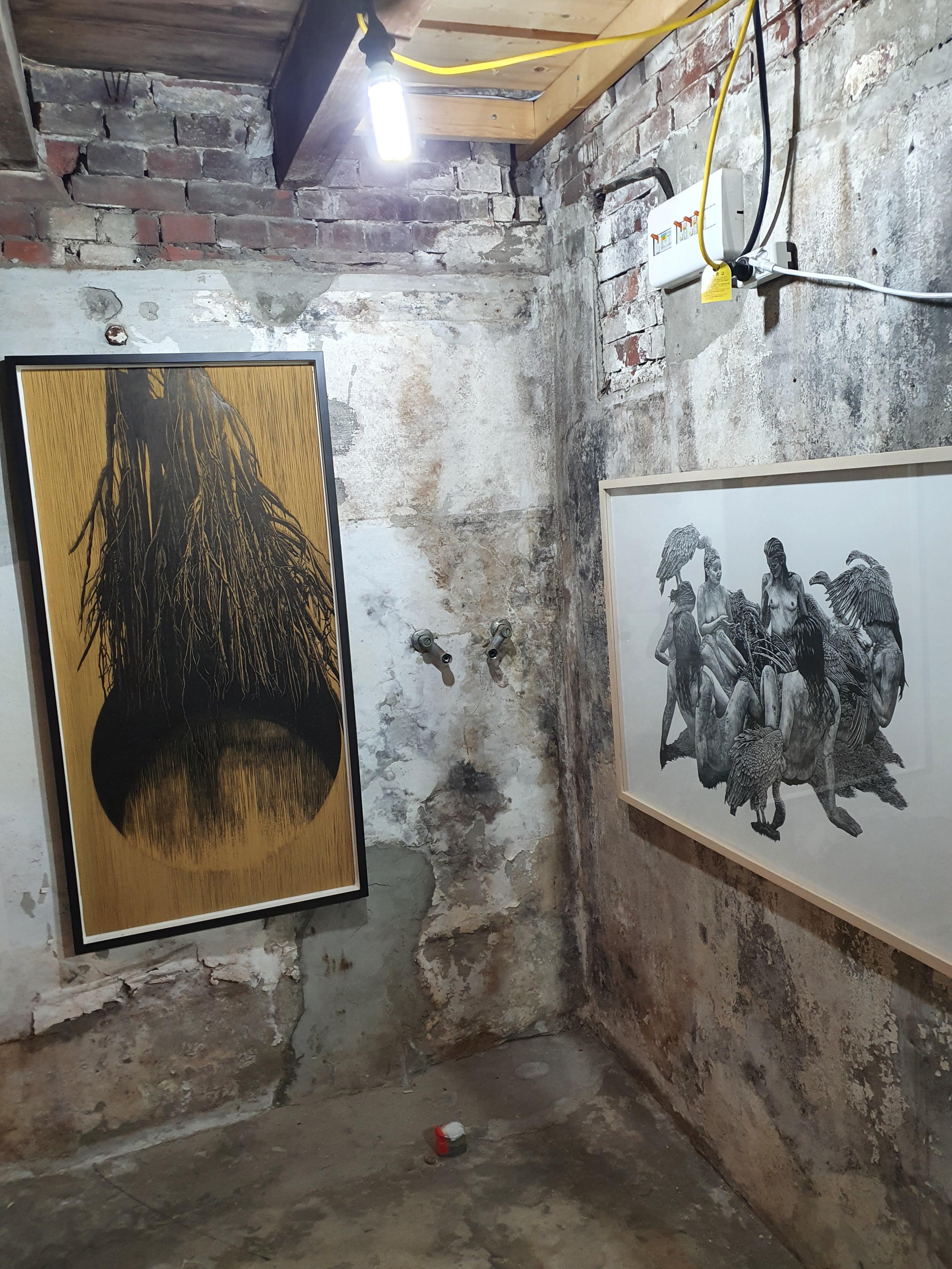 입구 오른편 깊게 들어간 좁은 통로 끝에 컴퓨터 한 대와 음향기기가 설치되어 있었다. 모니터에는 반투명의 비닐봉지가 어설프게 씌어 있는데, 이 오브제 자체가 예술품인 것일까. 아니면 작품의 필요한 시스템이 설치되어 있는 것인가. 이 생각에 대한 해답을 찾기 위해 일단 전시장 안쪽으로 이동했다. 전시장 벽면에는 몇 점의 판화 작품이 걸려있다. 인간과 새의 조합이 한눈에 보이는 작품들로 섬세한 날개의 표현이 돋보인다. 그리고 나무의 드러나는 뿌리를 표현한 작품도 있다.