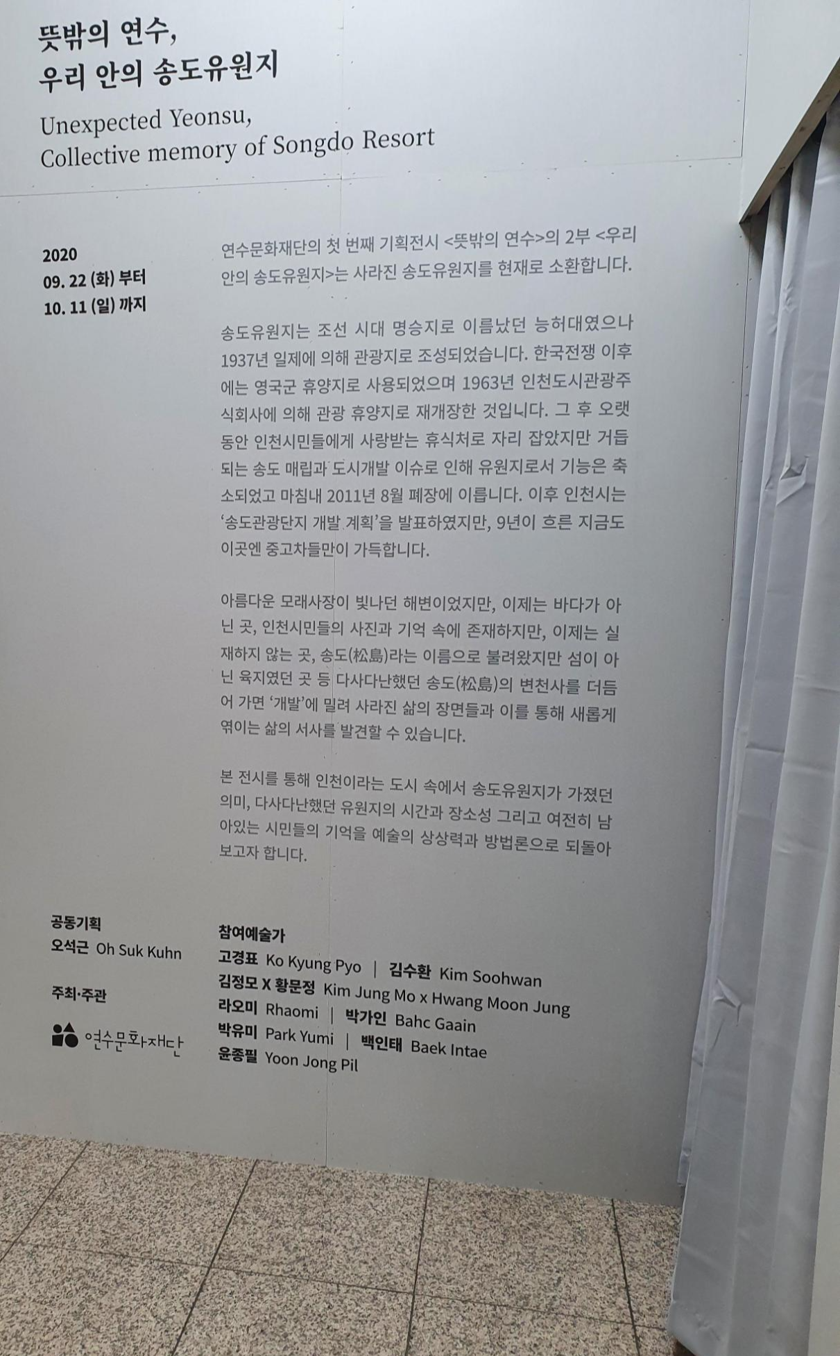 <뜻밖의 연수: 우리 안의 송도유원지>를 보고 나니 갑자기 지난 기억이 하나 떠올랐다. 10년 전 인천에서 자리 잡을 당시 만난 소중한 인천토박이 지인들이 있다. 그들과 함께 갔던 여름휴가 어느 밤에 서로 술잔을 나누며 나눈 이야기들이 생각났다. “우리 어릴 때는 놀러 간다고 하면 무조건 송도유원지였어!” 라고 인천토박이가 말하자 서울토박이 지인도 “야, 우리도 여름휴가는 송도유원지로 갔어!”라고 답했다. 송도유원지는 인천을 포함 가까운 수도권 지역 모든 이들의 빠질 수 없는 추억이었나 보다. 지방에서 나고 자란 우리 부부에게 송도유원지는 그저 타인의 추억일 뿐이었다. 그런데 뜻밖의 이 전시를 만나고 나도 이제는 송도유원지에서 한번 놀아본 진짜 인천인이 된 것 같다. 인천사람 필수 경험치 하나를 적립했다.