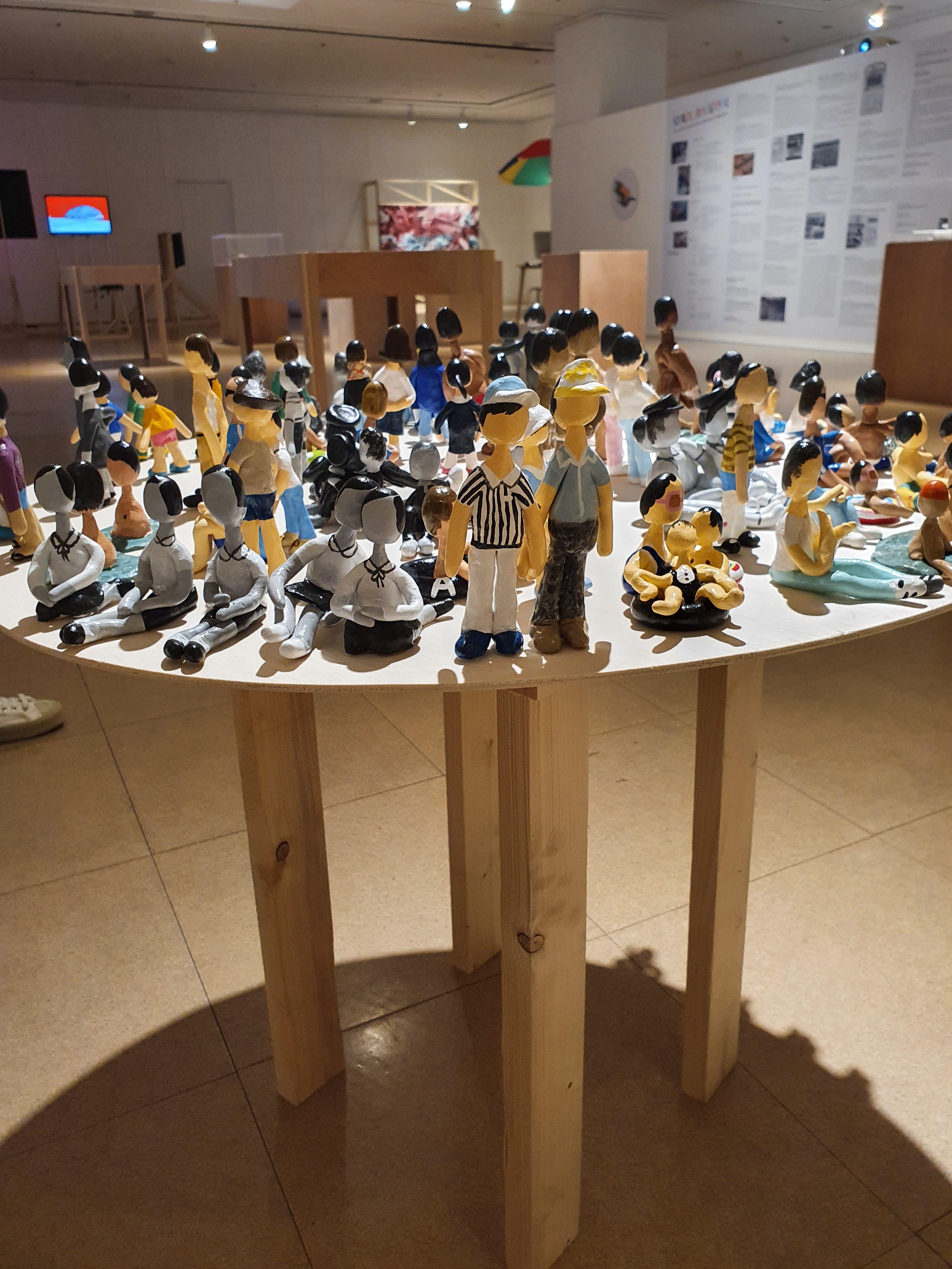 박가인 작가의 점토 인형들은 예전대로 다시 바글바글해진 송도 유원지를 점토로 재현했다. 작품 ‘예전대로 다시 바글바글해진 송도유원지’는 시민들로부터 받은 송도 유원지의 사진을 바탕으로 점토를 빚어 다양한 인물들의 행동을 표현했고, 눈코입은 생략하여 감정을 드러내지는 않았다. 가만히 살펴보니 저마다 다른 시절의 추억을 담고 있는 것이 자못 재밌다. 점토인형 하나하나가 저마다의 추억이 담겨있음을 짐작할 수 있었다. 이 점토 인형들은 송도 유원지로 꾸며진 이 전시장을 향유하는 행락객 또는 관람객들이다.