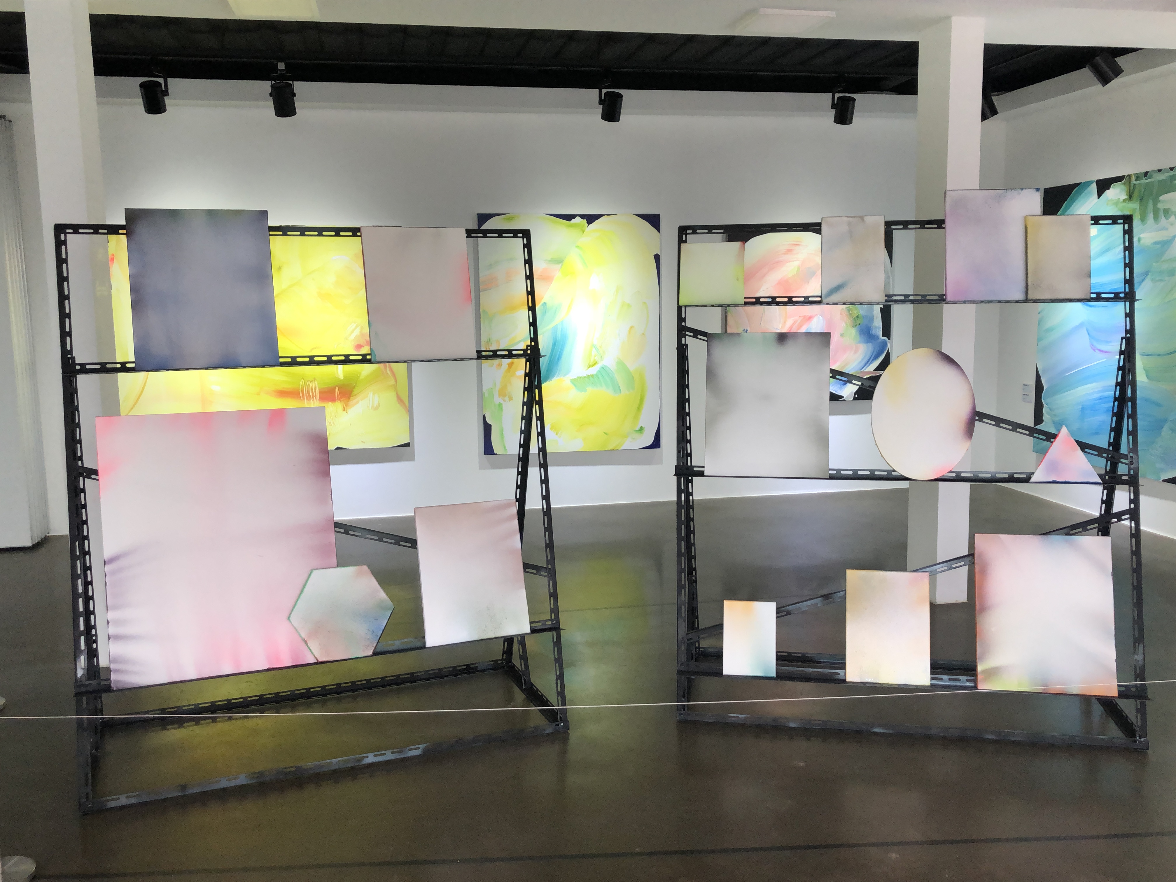 신현정 작가는 <날씨 회화_오늘의 신간>을 통해 2013년도부터 2019년도까지의 날씨를 담은 회화를 선보였다. 작품 제목인 <오늘의 신간>이라는 말에 걸맞게 벽에 못을 박고 그 위에 거는 일반적인 평면 설치의 형식에서 벗어나 작가들이 작품을 보관할 때 많이 제작하는 철제 앵글 위에 캔버스가 진열되어 있다. 이 작업은 일반 관객들에게 회화를 바라보는 방식을 새롭게 제안하면서 시선이 닿을 수 있는 작품의 면적을 캔버스 뒷면까지 확장했다. 날씨 회화 시리즈로 작가는 피부에 닿는 ‘온도’를 매일 기록한다. 그날의 습도, 온도, 외부적인 힘, 작가가 눌러 내리는 스프레이의 압력까지 다양한 경우의 수들이 담긴 여러 가지 모양의 캔버스와 표면에 새겨진 화면 바깥에서 스며들어온 물감의 입자는 관객에게 작가가 경험한 온도에 대한 상상력을 돋구기도 한다.