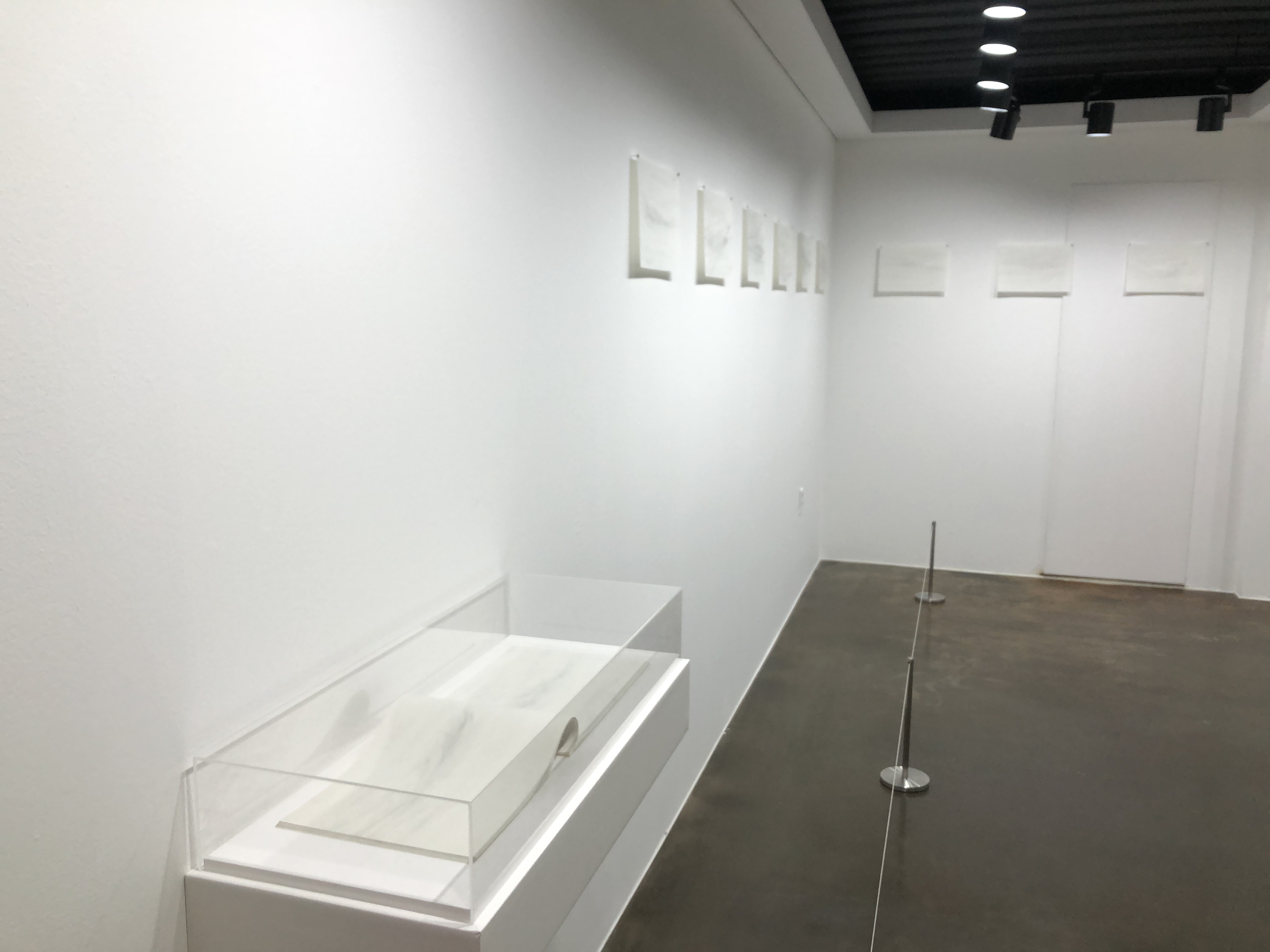 김윤수 작가의 경우 ‘시간’에 따른 바람의 형태를 기록하고 있다. 바람은 공기가 물리적으로 움직이는 형태로, 이번 전시에서 선보인 <바람은 쉼이 없이 세상의 모든 경계를 어루만져준다>는 시간에 따라 움직이고 있는 바람의 형태를 기록하고 있다. 작가가 그린 ‘바람’이라는 무형의 형상은 단순한 이미지로서 종이 위에 그려진 것이 아닌 화면 안에 생동하고 있는 생물로 느껴지기도 하는데, 관객이 벽면을 따라 이동함과 동시에 종이 안의 바람의 형상은 규칙적이지 않은 다양한 형태로 구현되어 간접적으로 작가가 느낀 감각을 체험하게 된다. 김윤수 작가는 우리가 보편적으로 느끼고 있는 바람의 형상을 매우 사실적으로 재현해내고 있다. 고착된 상태의 보편성이라기보다 모든 이들이 바람의 이미지로 인식할 수 있음을 의미한다. 김윤수 작가가 그려낸 바람은 매우 사적인 경험으로 이루어진 형상이지만, 섬세한 재료의 사용과 표현방식을 통해서 바람의 흐름, 결을 느낄 수 있는 매우 현실적인 형상으로 관객에게 감각적 공감을 일으킨다.