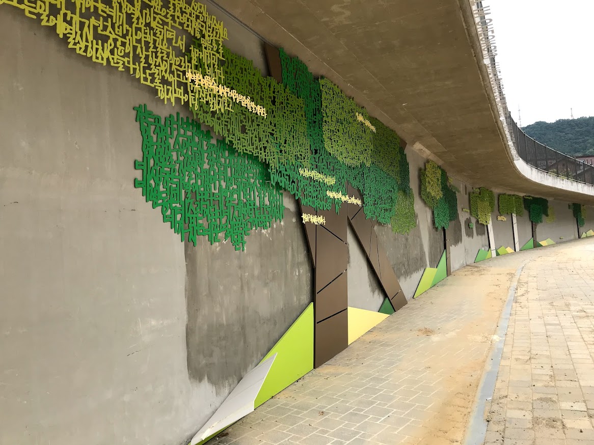 이 맥락에서 또 하나의 난립된 작업은 국립현대미술관 청주관 주차장 주변 벽장식에도 여실히 드러났다. 단기간에 어떻게든 무리하게 제작했던 작업이여서 그런 것일까. 주변 환경과 어울리지 않는 아크릴커팅 설치 작업은 시민으로서 어떤 맥락으로 이 작업을 언제까지 오랫동안 지켜봐야할지 안타깝기만 하다.