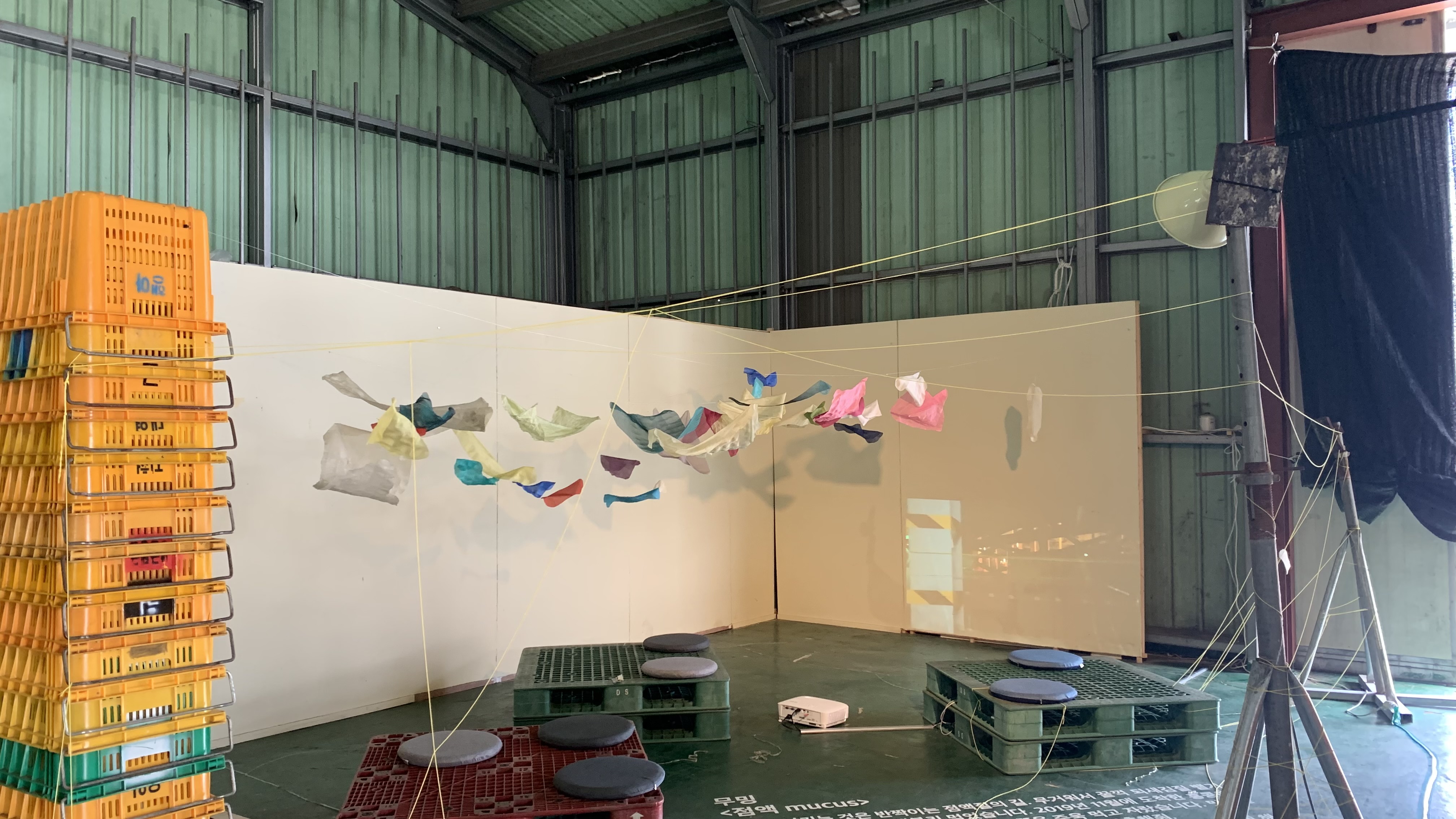 문화공간 비수기는 강정 평화 상단의 감귤 선과장으로 비수기 동안 문화공간으로 운영된다. 나무상자와 움직임이 그려지는 벨트장치가 감귤 작업이 한창일 때 모습을 상상하게 한다. 그곳에도 실로폰 장치가 만들어내는 소리가 바람이 느껴질 때마다 들린다(이곳에 잠깐 놓아두려고요, 신원정). 환대의 조각들 전시장마다 입구에서 사람들을 맞이해주는 수어 해설 영상과 점자 리플렛, 큰 글자 리플렛(한글/영문)이 어김없이 있다. 차곡차곡 쌓여있는 색바랜 감귤 상자들에 상영되고 있는 영상들을 보았다(NO SIGNAL, blblbg). 2011년 3월 도호쿠 대지진과 후쿠시마 핵발전소 사고 이후 무언가에 홀리듯 그곳에 방문하게 되었다는 작가의 이야기가 떠올랐다. 그가 무참하게 쓸려간 폐허 속 그곳에서 경험했다던 환대의 시간을 따라가다 보니 2019년 퍼레이드 진진진 영상 속에서 행진하는 사람들의 표정들과 만났다. 퍼레이드 진진진은 중증장애인을 포함한 사회적 소수자들이 스스로 말하기를 보여주는 프로젝트이다. 바로 옆 <흘러가는 진 퍼레이드> 에서는 각자의 속도대로 자기만의 표현방식으로 그리거나 외친 300여 점의 이미지들이 온라인 행진을 이어간다.