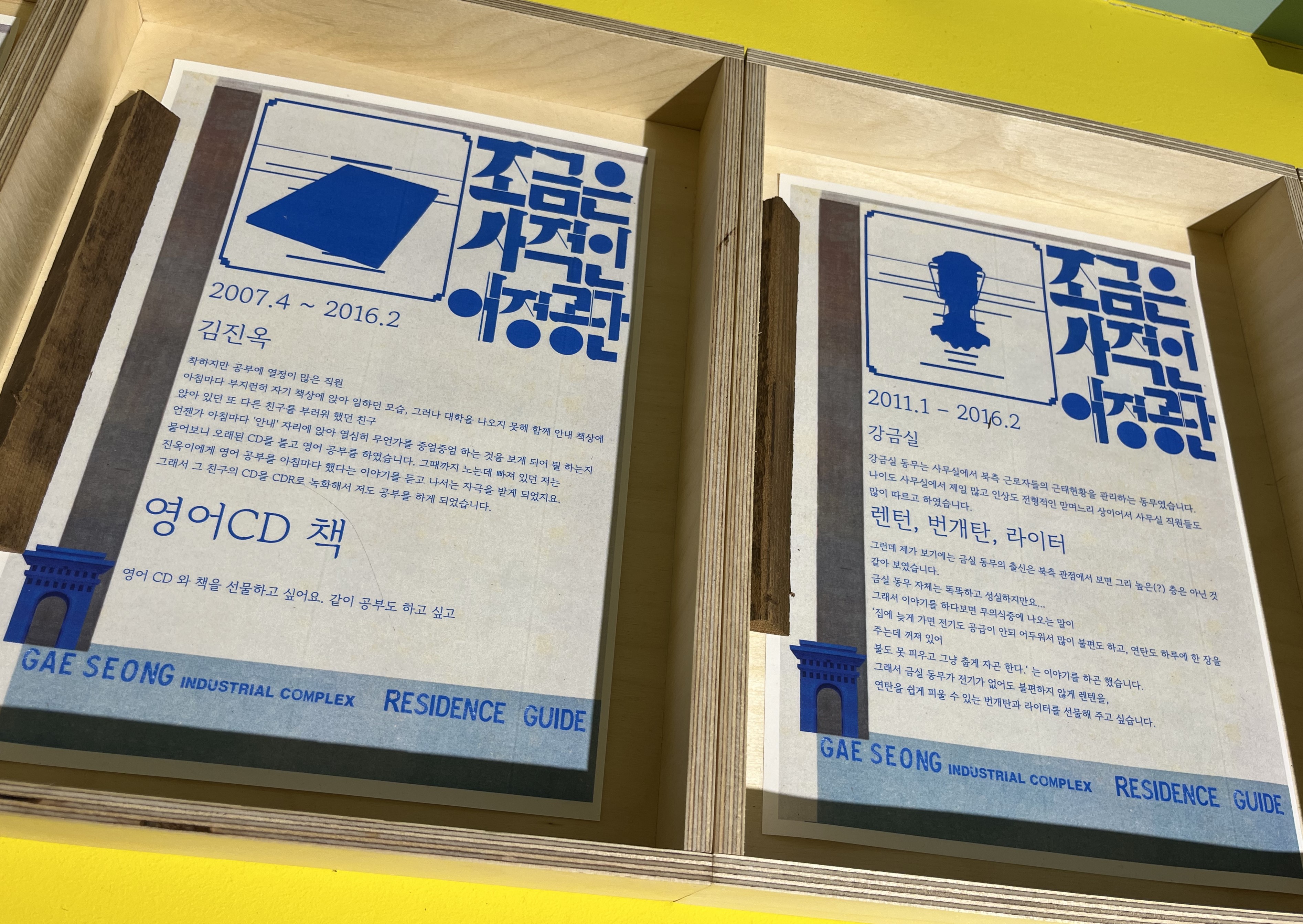 전시장에서 마주한 개성으로의 출경의 기억은 남북의 경계에 대한 또 하나의 이야기를 추가한다는 점에서 관심이 갔다. 그동안 주로 다뤄졌던 접경지 마을 사람들의 삶과 기억, 그리고 실향민의 서사와는 다른, 경계와 접경에 관한 또 다른 서사와 감각으로 인식되었다. 유니마루에 전시되어 있는 이부록의 작업《조금은 사적인 애정공단》(2021) 앞에서 조금 더 머물렀던 이유는 이처럼 경계에 대한 다른 이야기였기 때문이다. 작가는 개성공단에서 근무했던 남측 근로자들의 기억에 무엇이 남아 있을지에 대한 의문으로 이 작업을 시작했다고 한다. 작가는 개성공단에서 일했던 이들을 찾아가 인터뷰하였고, 과거에 개성에서 함께 근무했던 북측의 직원 중 누구에게 어떤 선물을 하고 싶은지를 질문하여 그것을 작업으로 기록했다. 견고하다고 생각했던 경계의 길목을 넘어 일상 속에서 평범한 모습으로 만났던 이들에 대한 사적인 기억들은 우리가 기존에 가지고 있던 남북의 경계와 접경의 서사를 재구성해가는 과정일 수 있다.