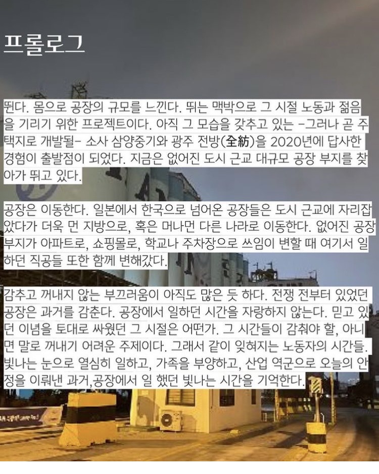 "뛴다. 몸으로 공장의 규모를 느낀다. 뛰는 맥박으로 그 시절 노동과 젊음을 기리기 위한 프로젝트이다."라고 기획의도를 밝힌 작가는 인천아트플랫폼에서 도보로 10여 분 떨어진 공장지대에 약 4km의 조깅 코스를 마련해 두었다. 개항도시의 역사와 시대적 산업산물로서의 인천을 가리키기엔 제법 어울리는 장소다. 서울 복판에 살고 있는 나는 휴일의 교통체증을 피해 가장 빨리 그곳에 도달할 수 있는 방법으로 전철을 선택하고 1호선을 탔는데 한 시간이 넘게 걸렸다. 첨단문명의 이면은 이처럼 도시의 화려함으로부터 외면 받고 도시인의 일상적 시야나 의식 바깥으로 밀려나 있다. 외곽의 공장지대를 찾아 지루함을 견디는 시간이 그것을 말했다.