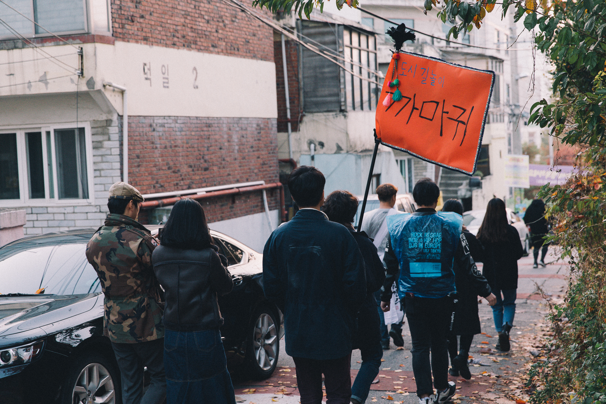 잔칫날 저녁 6시, 하늘이 짙어지기 시작하자 꽹과리를 앞세운 <연희집단 갱> 팀의 행렬이 집을 나섰다. 헐렁한 흰옷을 휘날리면서 찢어지는 소리가 나는 철제 악기를 연주했고, 팔과 다리를 번갈아 들어 올렸다 내렸다 춤을 추면서 곧 철거될 동네를 한 바퀴 돌았다. 이들의 춤은 전문 광대인 풍물패의 춤과, 이들을 따르는 농촌 사람들이 흔히 추곤 하는 막춤(소위 ‘할머니들이 추시는 어깨춤’)을 적당히 섞어 놓은 듯했다.