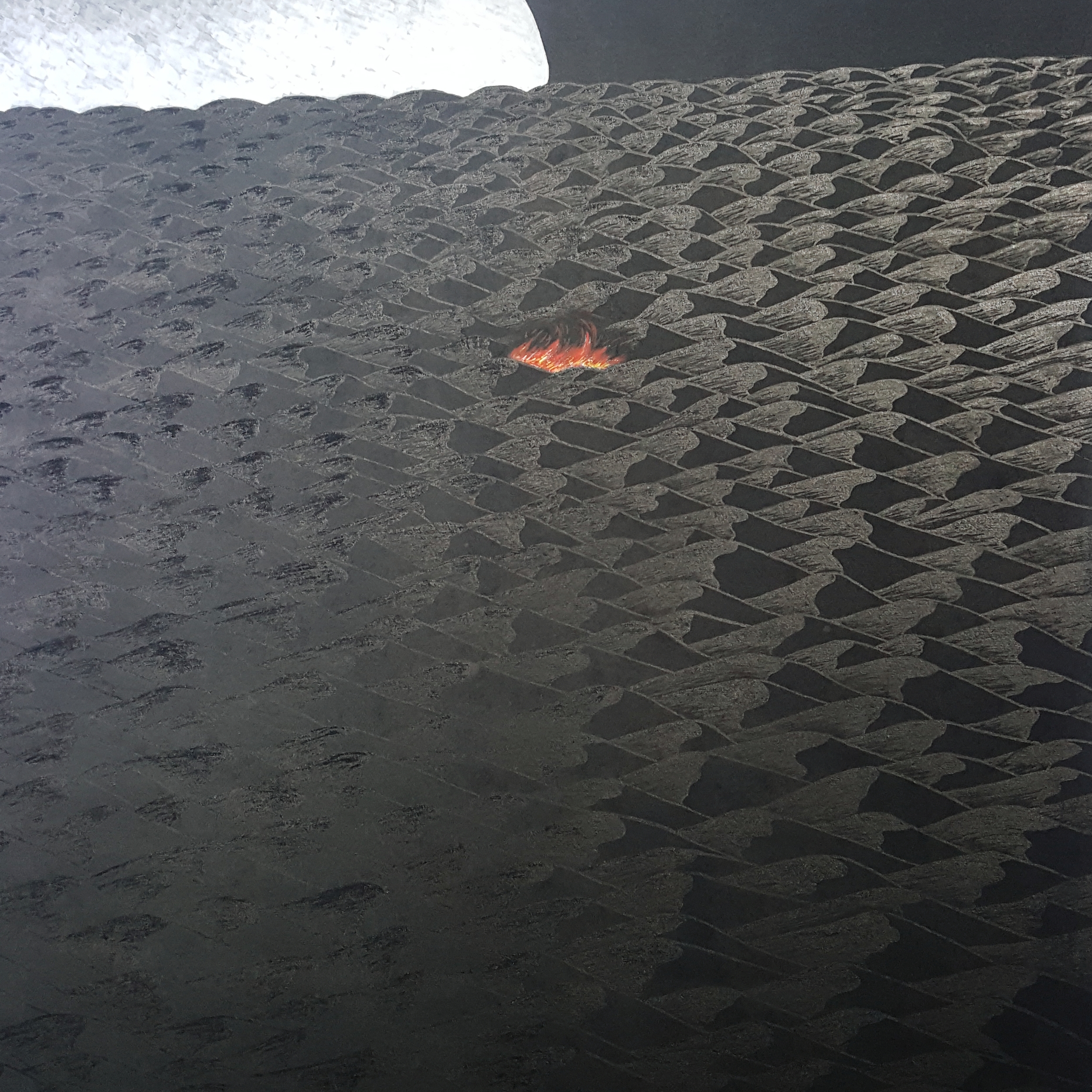 이것은 비단 재료들을 중첩시켜 표현하는 작가의 수행으로만 나타나는 것이 아닌, 그 수행을 감상자에게도 넘긴다는 점에서 더욱 그렇다. 먼저 작품의 중간 중간에 있는 응집된 색 덩어리는 감상자의 시선을 붙잡기를 시도한다. 그리고 전시장의 조명에 따라 감상자의 관람 동선에 따라 작가가 표현한 형상들이 흐르고 머무르기를 반복하면서 그 안에서 만들어진 에너지를 증폭시킨다. 이러한 장면은 감상자가 한 자리에서 렌티큘러 필름을 보듯 몸을 반복적으로 움직일 때 더 잘 나타난다. 빛을 받지 않은 곳은 칠흑으로, 빛을 받은 곳은 재료가 지나간 과정을 적나라하게 보여주며 작가의 관조적 수행을 감상자에게 옮긴 것이다. 이렇게 반복적 움직임으로 얻은 시각적인 출렁임은 결국 전시장 전체를 어떠한 막으로 감싼다. 감상자를 훑고 가는 그 기운은 작가가 말했던 형상들의 에너지, 즉 그의 내면에서 온 것으로 아마 작가의 밤을 지켰던 ‘껍데기’였는지도 모르겠다.